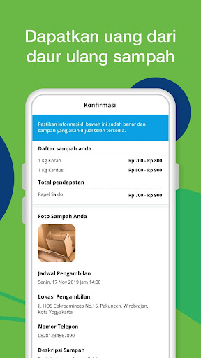 Rapel adalah Aplikasi untuk menjual sampah non-organik yang sudah dikelompokan dan dipilah dengan baik kepada kolektor atau agen pengepul sampah. Sampah yang dijual akan ditukar dengan uang dan akan mendapatkan poin untuk ditukar dengan berbagai hadiah menarik. Dengan Aplikasi Rapel ini diharapkan pengelolaan sampah di kota akan lebih baik demi menciptakan lingkungan yang lebih bersih Saat ini baru kota Jogjakarta dan sekitarnya yang tergabung dalam aplikasi Rapel ini sebagai pilot project. Download Aplikasi ini untuk anda yang berada di Kota Jogjakarta dan sama-sama belajar dengan User lain dalam hal pengelolaan sampah untuk hidup yang lebih sehat dan bersih. Fitur Aplikasi Rapel - Membuat List Sampah - Menentukan titik temu pengambilan sampah dengan kolektor - Negosiasi langsung dengan kolektor untuk harga jual final - Berita dan Info seputar management sampah - Mengumpulkan poin untuk ditukarkan dengan berbagai hadiah menarik Aplikasi Rapel ini bekerja-sama dengan para pengepul sampah yang profesional dan memiliki kolektor sampah yang dapat dipercaya dan terikat profesional dengan pengepul sampah profesional.