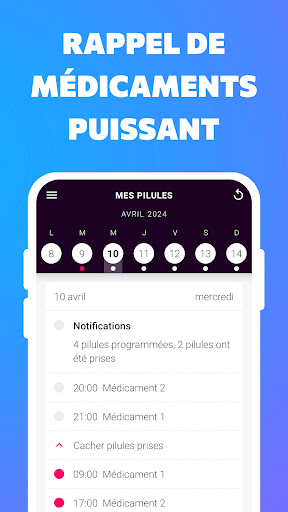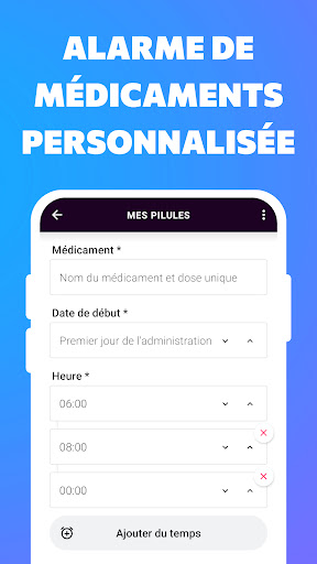 Rappel de médicaments est rappel facile à utiliser et fiable pour prendre médicaments à temps. Ce suivi prise de médicaments nous permet de programmer n\importe quel programme de traitement et de suivre la liste des médicaments dans une seule application pour médicaments gratuite. Rappel prise de médicaments nous permet de personnaliser chaque alerte de médicament avec des informations utiles sur la dose correcte de médicament ou sur le moment exact de prendre des médicaments, avant ou après un repas. Cette alarme médicaments peut même nous rappeler de prendre des médicaments jusqu\à ce que nous le fassions. Et il s\agit d\un rappel médicaments complètement hors ligne, nous n\avons donc pas besoin d\internet pour recevoir une alarme de traitement en temps opportun. Nous pouvons utiliser cette application comme rappel d\achat de médicaments, organisateur de médicaments, application pour médicaments personnels, rappel prise de médicaments pour toute la famille ou même comme suivi de traitement médical pour animaux de compagnie. Avec ce rappel de traitement, vous n’oublierez plus jamais une pilule. Ce rappel de médicaments vous aidera à toujours prendre le bon médicament, au bon dosage et au bon moment. Soyez simplement averti à l\heure prévue, prenez vos médicaments à l\heure et suivez votre historique de médicaments avec ce suivi prise de médicaments.