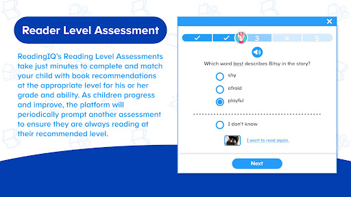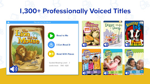 ReadingIQ est une bibliothèque numérique anglais complète pour enfants 2-12 ans, par les créateurs de ABCmouse Early Learning Academy. Organisé par des experts en lecture, chaque livre dans la bibliothèque ReadingIQ est attentivement sélectionné pour correspondre aux niveaux de lecture et fournit un accès aisé aux livres, qui ravira chaque type de lecteur.Les milliers de livres incluent des titres originaux et exclusifs, classiques enfances, et titres populaires dans une large gamme de sujets et genres - tous sélectionnés pour aider à apprendre et pratiquer l\anglais, offrant une expérience immersive, en lisant et écoutant des livres lits à voix haute. Débloquez l\aventure d\apprentissage de l\anglais avec ReadingIQ ! Caractéristiques : ● Une bibliothèque numérique anglaise immersive ● accès illimité à des milliers de livres. à tout moment Partout. ● environnement 100% sûr et convivial ● titres populaires et personnages que les enfants connaissent et aiment ● une collection complète de livres pour lecteurs âgés de 2 à 12 ans, organisée par des experts en lectures des US ● recommandations de livre pour chaque enfant basée sur son niveau de lecture ● Plus de 1000 titres audio professionnellement ● Capacité à superviser les progrès de votre enfant ● Milliers de livres, avec niveaux de lecture fournis ● Possibilité pour votre enfant de choisir ce qu\il veut lire ● Aide naturellement l\enfant à l\expérience anglaise ● Possibilité de prévisualiser le contenu que votre enfant explore ● Crée des compétences de lecture de l\anglais