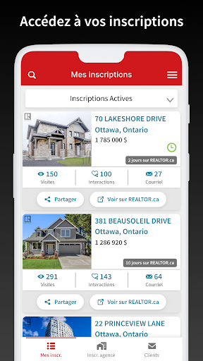 Courtiers et agents immobiliers : Accédez à votre compte REALTOR.ca, aux statistiques de vos inscriptions affichées sur les sites du SDDMC, et aux courriels de vos clients potentiels, dans une seule application! Grâce à l’Application REALTOR.ca pour les membres, vous pouvez tirer parti des rapports statistiques sur les inscriptions pour garder contact avec vos clients actuels, et adapter votre stratégie de marketing pour en trouver de nouveaux. Quelques-unes des fonctionnalités principales : • Notifications de clients potentiels : Recevez des notifications pour ne manquer aucun client potentiel! Vous pouvez consulter les demandes par courriel et y répondre immédiatement à partir de l’application. • Notifications sur les inscriptions : Recevez un avis lorsque votre inscription est affichée sur REALTOR.ca et lorsqu’elle est retirée du site. • Statistiques sur les inscriptions : Faites un suivi des statistiques de vos inscriptions actives et inactives. Découvrez notamment le nombre de fois qu’elles ont été consultées, ajoutées aux favoris, et partagées. • Envoi automatisé de rapports : Tenez vos clients informés en leur envoyant des rapports automatiques et périodiques de statistiques sur les inscriptions, par message texte ou par courriel. • Inscriptions de l’agence : Consultez les inscriptions actives de votre agence et partagez-les facilement dans votre réseau. Les courtiers et agents peuvent aussi trouver des données, des formulaires et des outils supplémentaires sur membre.REALTOR.ca. Des commentaires? Écrivez-nous à support@CREA.ca. Vous aimez l’ACI et REALTOR.ca? Aimez nos pages Facebook : https://facebook.com/CREA.ACI https://facebook.com/REALTORdotca Suivez-nous sur X (Twitter) : https://twitter.com/CREA_ACI https://twitter.com/REALTORdotca Suivez-nous sur Instagram : https://instagram.com/CREA_ACI https://instagram.com/REALTORdotca