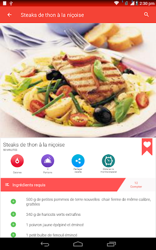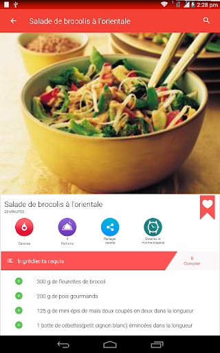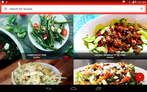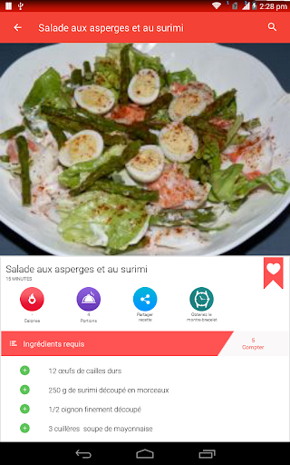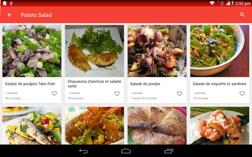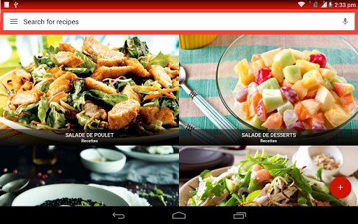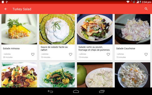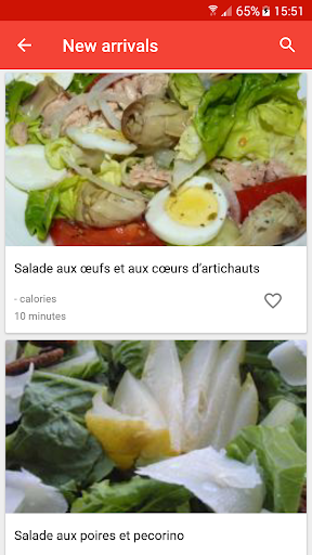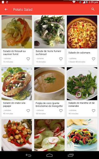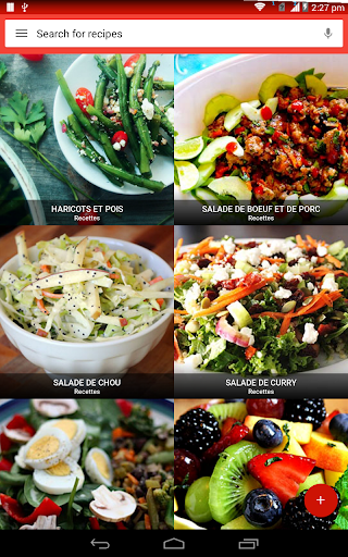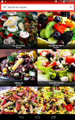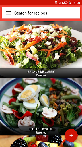 Une salade est un plat composé d\un mélange de petits morceaux de nourriture, généralement des légumes ou des fruits. Les salades sont généralement servies à température ambiante ou réfrigérées, à l\exception notable de la salade de pommes de terre du sud de l\Allemagne, qui peut être servie chaude. La salade peut être servie à tout moment pendant un repas. Les salades de fruits sont faites de fruits, qui peuvent être frais ou en conserve. Les salades de dessert comprennent rarement des légumes verts à feuilles et sont souvent sucrées. La salade est généralement habillée par le dîner avec de l\huile d\olive et du vinaigre. En Asie, il est courant d\ajouter de l\huile de sésame, de la sauce de poisson, du jus d\agrumes ou de la sauce de soja aux vinaigrettes. Les salades d\été sont le meilleur moyen de célébrer de délicieux produits de saison. Aux États-Unis, la \salade de poulet\ fait référence à toute salade de poulet ou à une salade spécifiquement mélangée composée principalement de viande de poulet hachée et d\un liant, comme la mayonnaise ou la vinaigrette. Ces recettes de salade sont parfaites pour les repas d\été et les dîners familiaux faciles et sont quelques-unes des meilleures façons d\utiliser les délicieux fruits et légumes de la saison. La plupart des bars à salade fournissent de la laitue, des tomates hachées, un assortiment de légumes crus coupés en tranches (comme les concombres, les carottes, le céleri, les olives et les poivrons verts ou rouges), des croûtons de pain séchés, des morceaux de bacon, du fromage râpé, etc. Apprenez tous les ingrédients, suivi d\une procédure étape par étape Recherchez et accédez à des millions de variétés de recettes de salade de la manière la plus pratique qui soit! Utiliser hors ligne L\application de recettes de salade vous permet de gérer toutes vos recettes préférées et votre liste de courses hors ligne. Obtenez des recettes faciles Accélérez la recherche de recettes! Vous pouvez ajouter jusqu\à cinq ingrédients dans le panier. Une fois que vous avez terminé, cliquez sur trouver des recettes et vous aurez une savoureuse salade devant vous! Vidéos de cuisine Vous pouvez rechercher et trouver des milliers de vidéos de recettes de salade qui vous aident à cuisiner de délicieux plats avec des instructions vidéo étape par étape. Communauté de chefs Partagez vos recettes de salades préférées et vos idées de cuisine avec des gens du monde entier.