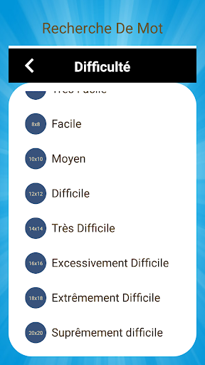 Vous pouvez commencer un nouveau jeu de recherche de mots dans de nombreuses difficultés et également avec une limite de temps pour le rendre plus difficile. Avec plus de 30 000 mots, notre recherche de mots ne sera jamais ennuyeuse. Si vous voulez, vous pouvez aussi changer la langue en plusieurs mots et jouer au jeu en allemand, grec, italien, portugais, espagnol et beaucoup d\autres langues. Vous pouvez également obtenir plus de conseils et plus de temps pour terminer un jeu de mots Jeu de Mots en Français