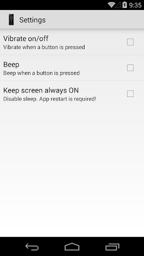This app uses your cell/tablet\s built-in IR blaster (infrared LED) - no additional hardware is needed. Supported devices: HTC One M7/M8, LG G3 Stylus, Lenovo Lifetab, TCT / Alcatel I221, Samsung Galaxy series like S4, S5, Note, Tab, Mega etc... You must point your phone’s IR blaster directly at the TV. Usual working range is 3 - 10ft. NB! Tab3 7\-8.4\ and Tab4 7\-8.4\ owners! Your tablet has portrait (not landscape) screen, but the IR transmitter is located on left or right side of your tablet (not on top side). So, if you holding your tablet in portrait mode then please don\t forget to point your tablets IR transmitter\s led (IR-blaster) directly at the TV ! Disclaimer/Trademarks: Vizio is a trademark of Vizio Inc. This app is NOT affiliated with or endorsed by Vizio. Warranties: This free software is provided \\as is\\ and any express or implied warranties, including, but not limited to, the implied warranties of merchantability and fitness for a particular purpose are disclaimed. In no event shall author be liable for any direct, indirect, incidental, special, exemplary, or consequential damages (including, but not limited to, procurement of substitute goods or services; loss of use, data, or profits; or business interruption) however caused and on any theory of liability, whether in contract, strict liability, or tort (including negligence or otherwise) arising in any way out of the use of this software, even if advised of the possibility of such damage.