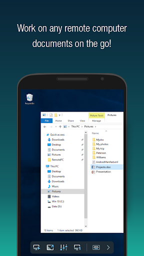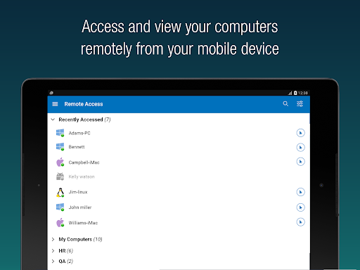 Install the RemotePC app on your mobile devices and access your computer remotely from anywhere. With a speed of 60 FPS and 4K quality, connect to your office or home computers remotely after hours, while traveling, etc., via the RemotePC application and access files and folders along with emails and software applications. Features: * Instant remote computer access provided there is an active internet connection and RemotePC application installed on it. * Provides efficient team work with friends or colleagues by accessing their remote computers and to work on presentations, documents, view/edit media files, etc. * Access PCs and MACs using your Android devices. * Access Android devices and Chromebooks from computers or another Android device. * Enhanced performance and low latency. * Cross-platform compatibility (Windows, Mac, Linux, Android) 60 FPS speed allowing 4K quality. * Faster remote streaming for gamers. Functionalities: * Transfer files via your android devices and computers with/without remote session. * Session recording: Record remote sessions while accessing via Android devices. * Clipboard actions: Control clipboard actions (copy and paste) from your Android devices. * Enable inactivity timeout to retain remote session running in the background for the specified time. * Lock the remote system via your Android device. * Choose between better quality and speed of your remote device. * Change the screen resolution of your remote device from Android device. * Access and manage logged off and locked devices remotely. * Access a remote machine while using other applications on your Android device using picture-in-picture mode. * Enable background sound for remote devices during remote sessions. * Remote printing of documents and images using a local printer. * Chat with the recipients for effective communication. * Enable ‘Trusted Devices’ for enhanced security of your RemotePC account. * Enable ‘Blank Host Screen’ to work privately on your remote device by turning the screen blank. * View multiple monitors at the same time for Enterprise accounts. * Restart your remote system via the Android device in a safe mode. * Collaborate effectively by using Whiteboard to draw on the remote screen. What’s New? * Add comments for configured remote devices - other users can refer for instructions. * Add copied texts on OS-level screens using clipboard as keystrokes option * Access files/folders on remote computers using any Android device or Chromebook. * Perform search, upload, and download operations while accessing the files/folders on your remote computer. * Enhanced performance and low latency * Cross-platform compatibility (Windows, Mac, Linux, Android) * 60 FPS speed allowing 4K quality * Faster remote streaming for gamers * Record remote sessions while accessing via Android devices. * Control clipboard actions (copy and paste) from your Android devices. * Remove the saved ‘Personal Key’ and/or ‘System Authentication’ (SAUTH) of the devices configured in your RemotePC account using Clear Credentials