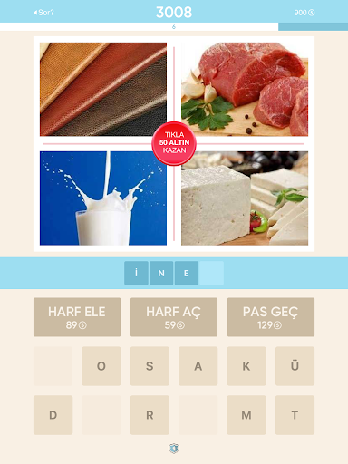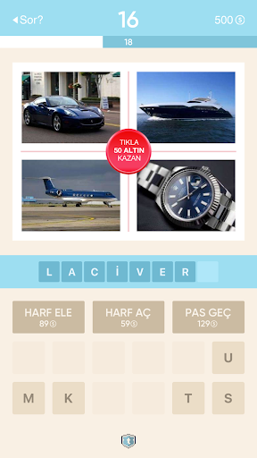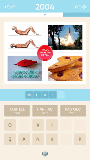 Resimler hangi kelimeyi anlatıyor? 4 Resim 1 Kelime Saatler süren eğlence... Bakalım tüm kelimeleri bulabilecek misin? YENİLİKLER: ---------------------------------------------------------------------------------- GÜNLÜK HEDİYE KARTI • 9 kart içinden birini seç ve ödülü kap. VIDEO IZLE ALTIN KAZAN • Video Reklam izleyerek ihtiyacın olan altınları tamamlayabilirsin. YARDIMCI • Bildirim özelliğini kabul edersen takıldığın kelimeler gün içinde bildiriliyor. KELİME SANDIĞI • Hedef kelimeye ulaşırsan hediye altınlar senin. YILDIZ SANDIĞI • Hedef yıldız sayısına ulaşırsan hediye altınlar senin. GÜNLÜK HEDEFLER: ---------------------------------------------------------------------------------- ÜÇ YILDIZ • 10 Kelimeyi 3 yıldızla geç 1000 altın kazan. HARF AÇ • 3 Kez harf aç 1000 altın kazan. HARF ELE • 2 Kez harf ele 1000 altın kazan. HARF TOPLA • İstenilen harfi istenildiği kadar topla 1000 altın kazan. Süre 60sn. 3 yıldızla başlıyorsun her yıldız 5 altın. ---------------------------------------------------------------------------------- HARF ELE • Kelimede bulunmayan harfleri ele HARF AÇ • Kelimedeki harflerden birini aç PAS GEÇ • Kelimeyi pas geç