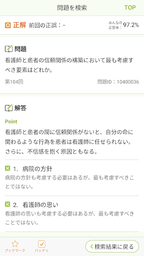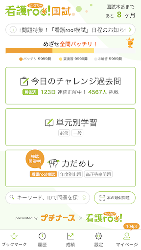 看護roo!(カンゴルー)国試は、看護師国家試験の過去問を集めたアプリです。 第114回〜第95回の問題約5000問を収録。日々の勉強をしっかりサポートします! ◆看護roo!国試のココがオススメ◆ 1)20年分の過去問すべてに最新の解説つき 2)合否判定付きの看護roo!模試が受験できる 3)「領域ごと」「年度ごと」「高正答率のみ」「1日1問」と出題方法もいろいろ 1)20年分の過去問すべてに最新の解説つき 問題・選択肢ごとに解説を確認でき、「なぜ間違ったのか」の理解につながります。 統計の問題などは最新の数値に改変しているため、過去問特有の「昔の数値で覚えてしまう」心配はありません。 2)合否判定付きの看護roo!模試が受験できる 国試の本番と同じ問題構成のミニ版模試などを\毎週末\開催! 本番さながらの配点・ボーダーライン算出方法で、自分の実力をチェックできます。 3)「領域ごと」「年度ごと」「高正答率のみ」「1日1問」と出題方法もいろいろ 「ニガテな領域」「絶対に落とせない問題」 など、自分がいまやるべき問題を見つけてチャレンジできます。 気になった問題をブックマークしておく、間違った問題だけやり直しするなど、使いこなし方も人それぞれ。 合間でちょっとだけ勉強したいとき、しっかり実力をつけたいとき、どちらのシーンでもあなたの味方となるアプリです。 看護師・看護学生向け総合サイト「看護roo!(カンゴルー)」が、看護学生の勉強に役立つようにと、このアプリを作りました。 アプリを使った人が、一人でも多く看護師になって活躍できるよう願っています。 使っていて不便なところ、勉強中にあったら便利な機能などございましたら、ぜひご連絡ください。 【ご意見・ご要望・不具合などのご連絡はこちら】 kokushi@kango-roo.com 【国家試験情報はこちら】 https://www.kango-roo.com/kokushi/