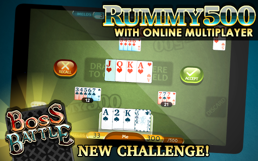 Now with a brand new Online Multiplayer mode! Compete for Weekly prizes and enjoy all your favorite game modes with players from around the world! This latest release also brings in a new Boss Battle mode for our most engaged users! Play against King Rummy and win exciting prizes! Rummy 500 is the BEST Rummy game created for Android. Rummy 500 offers four levels of difficulty, 6 unique game modes as well as extensive statistics tracking. It is an unparalleled game play experience! Now with 7 unique themes and great daily challenges! Customize your game to your liking and come back every day for a new chance to earn additional coins and unlock the latest theme! Also includes Facebook integration! Personalize your game, earn experience with every game, never lose your statistics! Your statistics are now stored in the cloud and shared between all your devices. Features: • Realistic gameplay and graphics • Intuitive single player gameplay • 4 difficulty options • 6 game modes: Regular, 3-Player, Speed Rummy, Team Play, Persian and Dealer\s Gambit. • Extensive Statistics, including games and hands breakdown. • Facebook integration - personalize your game and save your progress. • 7 unique themes to customize your game play experience! • Daily Challenges! Come back every day for an additional chance to earn coins!