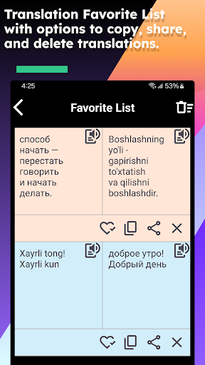 Unlock the world with Russian Uzbek Translate, the ultimate tool for seamless communication across languages. Whether you\re traveling the globe, learning a new language, or needing quick translations for work or personal use, Russian Uzbek Translate is your go-to app. Dive into a world where language barriers dissolve and communication flows freely. * Instant Translations :- Experience the power of instant Russian Uzbek Translate. Simply type or paste your text, and receive accurate translations in seconds. Whether it’s a simple phrase or a complex paragraph, Russian Uzbek Translate delivers fast and reliable results. * Voice Translation :- Speak and translate on the go. This feature allows you to communicate in different languages effortlessly. Perfect for real-time conversations, the app can translate spoken language to text and vice versa, enabling fluid dialogue in any situation. * Text-to-Speech :- Hear your translations spoken aloud with natural and clear pronunciation. This feature not only aids in understanding but also helps you learn correct pronunciation, making it an excellent tool for language learners. * Phrasebook :- Save your most commonly used translations for quick access. Organize and store phrases for travel, business, or daily conversations, ensuring you have them at your fingertips whenever needed. * User - Friendly Interface :- Enjoy an intuitive design that makes navigation a breeze. The clean and straightforward interface ensures you can start translating immediately without any learning curve. Why Choose Russian Uzbek Translate? * Accuracy :- Powered by advanced translation algorithms, Russian Uzbek Translate provides precise and reliable translations, ensuring your communication is always clear and correct. * Versatility :- Whether you need text, voice, or camera translations, Russian Uzbek Translate covers all your needs in one comprehensive app. * Privacy :- We prioritize your privacy. Your data is secure, and we ensure that your personal information is protected at all times. Who Can Benefit? * Travelers :- Navigate foreign countries with confidence. Translate signs, menus, and conversations effortlessly, making your travel experiences smoother and more enjoyable. * Professionals :- Break down language barriers in international business. Communicate effectively with global clients and colleagues, and ensure your messages are always understood. * Everyone :- Whether you’re curious about new languages, need translations for daily tasks, or want to connect with people from different cultures, Russian Uzbek Translate is the perfect tool for everyone. Additional Highlights: * Customizable Settings :- Tailor the app to your preferences. Choose your default languages, adjust speech speed, and manage your saved translations. * Regular Updates :- Benefit from continuous improvements and new features. Our team is dedicated to enhancing your translation experience. * Customer Support :- Get help whenever you need it. Our responsive customer support team is ready to assist you with any questions or issues.