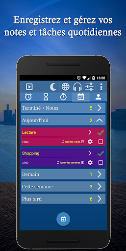 Cette application est plus qu’un réveil, Réveil Plus Millenium regroupe quatre merveilleuses fonctionnalités en une seule application multilingue: ★ Un réveil complet et unique en son genre équipé d\un chronomètre professionnel et des minuteries illimitées. l\application comprend également des widgets. ★ Une liste de vos tâches quotidiennes. ★ Une liste de vos contacts qui vous permet de les contacter mais aussi de ne pas rater leur anniversaire. ★ Un lecteur de musique relaxante pour vous endormir en douceur avec l’option de réduction progressive du volume. 1\\ Réveil + Chronomètre + Minuteries: En plus des fonctionnalités de base d’un réveil, Réveil Plus Millenium vous permet de : ★ Configurer une alarme avec votre voix rien qu’en dictant l’heure. ★ Vous réveiller en douceur avec l’option d’augmentation progressive du volume. ★ Choisir le mode d’arrêt qui vous convient (bouton, calcul mental(math), code Captcha, test visuel, agiter, retourner). ★ Sauvegarder des alarmes soit pour une heure précise ou dans un certain temps. ★ Définir et activer un profil par défaut des alarmes. ★ Régler l’intensité de lumière de l’écran durant l’alarme. ★ Voir la météo de votre cité en un seul clic. ★ Régler les paramètres du vibreur… Il comprend aussi un chronomètre professionnel et des minuteries pour vos besoins quotidiens. 2\\ Tâches : Vous pouvez ajouter des tâches avec Réveil Plus Millenium d’une manière très interactive : ★ Configurer une tâche avec votre voix rien qu’en dictant le mot Tâche et l’heure. ★ Dicter la tâche. ★ Choisir si la tâche est à une date et heure précise ou dans un certain temps. ★ Sélectionner la fréquence de répétition de la tâche. ★ Définir et activer un profil par défaut des tâches. ★ Visualiser par ordre chronologique les tâches programmées… 3\\ Contacts: Réveil Plus Millenium vous offre une gestion personnalisée de vos contacts avec leurs anniversaires, vous pouvez: ★ Ajouter ou importer les coordonnées de vos contacts(nom, numéro de téléphone, Email). ★ Ajouter une photo pour chaque contact. ★ Ajouter la date de naissance pour avoir une notification lors de chaque anniversaire. ★ Appeler le contact à tout moment ou lui envoyer un SMS ou un Email. ★ Envoyer un message automatique et personnalisé à chaque notification d’anniversaire… 4\\ Sommeil & Relaxation : Réveil Plus Millenium vous offre un outil précieux pour vous relaxer durant une sieste ou vous aider à vous endormir en douceur avec des musiques de relaxation. **Attention** ne pas arrêter l’application avec un task killer car ce dernier supprime toutes les alarmes et notifications. Le guide d\utilisateur vous explique soigneusement les fonctionnalités de l’application. Si vous avez des questions ou pour signaler un éventuel bug, vous pouvez vous connecter sur notre site web ou nous contacter par Email à: support@milleniumapps.com. Langues supportées : Arabic, English, Français, Čeština, Danske, Deutsch, Dutch, Español, Italiano, Norsk, Polski, Português, Pусский, Svenska, 日本語(ja), 中文(zh-cn), 中文(zh-tw), 한국의(ko),हिंदी. Autorisations principales requises: - Autorisation Réseau nécessaire pour l\option météo. - Lire / Ecrire sur stockage externe nécessaire pour les options sauvegarde et restauration - Autorisation Contacts nécessaire pour importer des contacts. - Autorisation de modifier les paramètres système nécessaires pour insérer la prochaine alarme sur le système (pour l\obtenir sur d\autres widgets).