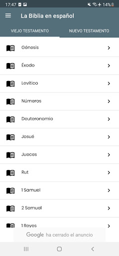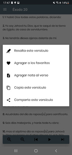Sagrada Biblia sin conexión para Android con texto y Audio disponible Recibe todos los días un versículo en tu dispositivo con la Palabra de Dios. Principales opciones disponibles: ➪ Versos para compartir en redes sociales, WhatsApp, Facebook, correo electrónico. ➪ Versos con opciòn de copia. ➪ Realiza búsquedas por nombre o número del libro. ➪ Lectura en pantalla completa. ➪ Cambia el tamaño de la letra, cambiar el verso del tamaño de la pantalla y la separación entre los versos. ➪ Posibilidad de evangelización, y puede buscar en los versos de la Biblia o un texto de forma gratuita. ➪ Con la palabra del día, recibirá un mensaje todos los días a la hora que desee. ➪ Escuche los versículos y medite en la palabra de Dios (necesita internet). ➪ Fácil uso. ➪ Lectura sin conexión a Internet, completamente fuera de línea. ➪ Capacidad para compartir la aplicación con sus amigos y familiares.