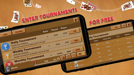 Presenting the classic multiplayer card game Schnapsen, also known as Sixty-Six, 66, Santase, and more! Play live online against thousands of active players or train offline against the computer. Schnapsen is a popular card game in Central Europe, with various names such as 66, Santase, Bummerl, Sechsundsechzig, Snapszer, Šnaps, Soixante-six, gra karciana, Šnops, and Šešiasdešimt šeši. It\s played in countries like Austria, Slovenia, Hungary, Germany, Switzerland, Romania, Croatia, Slovakia, and Italy. Play Sixty-Six with friends online Sharpen your Schnapsen skills and top the 66 high score lists Battle against the computer in multiple difficulty levels or chat with other players Experience realistic Schnapsen cards on the table and enjoy the ambiance of a traditional tavern Get ready to compete in thrilling tournaments against players from all around the globe! Showcase your skills and strategies in intense Schnapsen matches and prove you have what it takes to be a true champion. Climb the ranks and earn your spot at the top of the leaderboard as you challenge opponents from various countries. Join the international Schnapsen community, make new friends, and engage in exciting matches that will keep you coming back for more. So, gather your deck, sharpen your skills, and immerse yourself in the exhilarating world of global Schnapsen tournaments! Sixty-Six is a free 5-card game played with a deck of 20 cards, including Ace, Ten, King, Queen, and Jack, with point values of 11, 10, 4, 3, and 2, respectively. The dealer alternates, and each player receives five cards. The top card of the remaining deck is turned face-up to show the trump suit, with the remainder placed crosswise on the trump card game. The non-dealer starts the first trick. A \trick\ is won by the highest card of the suit led, unless the trick contains a trump card, in which case the highest trump card wins. The winner takes the trick, turns it face down, and doesn\t look at it again. If a player reaches 66 points, they win points as follows: One new game point if the opponent has 33+ card points Two game points if the opponent won at least one trick and has 0-32 card points Three points if the opponent hasn\t taken any tricks Play Schnapsen alone or with friends. It\s free and easy to learn, but you\ll need to develop strategic thinking and tactics to beat your opponent!