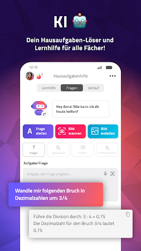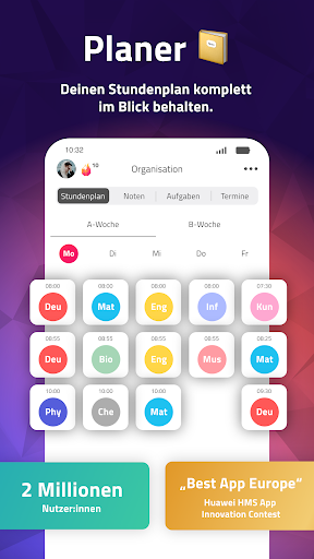JETZT NEU! Verstehe jetzt deinen Schulstoff noch besser mit unserer KI-Lernhilfe. Mit über 2 Millionen Schülern ist scoolio die Nr. 1 Schülercommunity für Organisation und Zukunftsplanung. Sei aktiv, sammle Juwelen und löse sie für coole Sachen ein. Plane deinen kompletten Tag in der Schule, nutze den Hausaufgaben Löser und chatte mit Schüler:innen. Die perfekte Schulapp. Winner „Best App“ in Europa beim „Huawei HMS App Innovation Contest“ WARUM DIE SCOOLIO APP? Hausaufgaben KI! Jetzt mit KI-Lernhilfe. Antworten auf JEDE (Schul-)frage und Hausaufgaben mittels künstlicher Intelligenz! Dein Hausaufgaben Löser. Besseres Zeitmanagement! Checke jederzeit deinen Stundenplan und lass dich an Hausaufgaben, Klausuren erinnern. Leute mit den gleichen Interessen! Nutze den Chat, um dich über Themen aus der Schule auszutauschen. Ausbildung oder Studium entdecken! Finde deinen Ausbildungs-, Praktikums- oder Studienplatz und stelle deine Fragen. Aktivität wird belohnt! Nutze die Schulapp täglich und erhalte fancy Abzeichen als Belohnung. ️ Schulalltag organisieren STUNDENPLAN • Verwende im Stundenplan A und B Woche. • Individuelle Stundenzeiten und Farben im Stundenplan. HAUSAUFGABEN KI • Fragen & Hausaufgaben abfotografieren, eingeben oder einsprechen und von der KI lösen lassen. • Bilder generieren lassen - perfekt für Mitschriften, Lernunterlagen, Referate oder zum besseren Einprägen von Themen. • Effizientes Lernen durch Erstellung von Lernzetteln oder Erläuterungen durch künstliche Intelligenz. • Stelle verschiedenen Charakteren deine Fragen. • Hausaufgaben Löser - 24/7 erreichbar sind - immer wenn du es brauchst. • Hilfe bei Übersetzung und Umformulierung von Texten. HAUSAUFGABEN UND TERMINE • Separate Liste für Termine und Hausaufgaben. • Erinnerungsfunktion für alles Wichtige in der Schule via Push Benachrichtigung. • Synchronisation mit deinem Smartphone-Kalender. NOTEN • Automatische Berechnung des Notendurchschnittes und Gesamtdurchschnittes. • Wähle aus 10 verschiedenen Notensystemen. • Verwende die individuellen Notentypen und Notengewichtungen deiner Schule. Chatten & neue Leute COMMUNITY • Von Chat-Freundschaft bis BFF. Entdecke Schüler und Schülerinnen in deiner Nähe. • Versende Geschenke! Zeige der #scooliocommunity deine Wertschätzung. Praktikum, Ausbildungs- oder Studienberuf finden PRAKTIKUM, AUSBILDUNG & STUDIUM • Entdecke Ausbildungsberufe, Ausbildungsvideos und lass dir Informationen zusenden. • Finde dein Ausbildungs-, Praktikums- oder Studienplatz. • Stelle Unternehmen die Fragen, die dich interessieren. Für dich ist scoolio die beste Schulapp: Hausaufgaben KI & Hausaufgaben Löser nutzen und bessere Noten schreiben! DU HAST FRAGEN ODER IDEEN? • scoolio, die beliebteste Schulapp lebt durch DICH! Sende uns dein Feedback an support@scoolio.de.