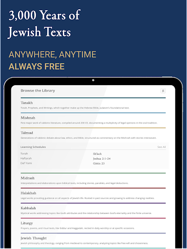 Sefaria delivers 3,000 years of Jewish texts (Torah, Tanakh, Mishnah, Talmud, and more) to your smartphone. All texts in the library are available in Hebrew along with a growing body of English translations. Search by keyword or browse the table of contents to explore texts, translations, and commentaries. Plus - the entire library can fit on your phone (500MB) so you can learn while you\re offline. Sefaria is a non-profit organization that creates open source software and publishes digital texts with open licenses. FEATURES • Calendars for reading Parashat HaShavua, Daf Yomi, 929, Rambam Yomi and Mishnah Yomit • Offline access to all texts and connections in Sefaria\s library. • Nine Torah commentaries in English: Rashi, Sforno, Or HaChaim, Rabbeinu Bahya, Rashbam, Siftei Chachmim, Chizkuni, Tur HaAroch and Rabbeinu Chananel • Over 50 commentaries on Tanakh including Ibn Ezra, Ramban, Abarbanel, Kli Yakar, Alshich, Haamek Davar, Malbim, Shadal, Radak, Ralbag and Gur Aryeh • Over 15 Mishnah commentaries including Bartenura, Ikar Tosafot Yom Tov, Rambam, Yachin, Boaz, Gra and Rosh Mishantz • Over 30 Talmud Bavli commentaries including Rashi, Tosafot, Ritva, Rashba and Rosh. • Other genres include Midrash, Halalkha, Kabbalah, Liturgy, Philosophy, Chasidut, Musar, Responsa, and more. LEARN MORE New texts are being added to the database all the time. Find out more about the project at: http://www.sefaria.org