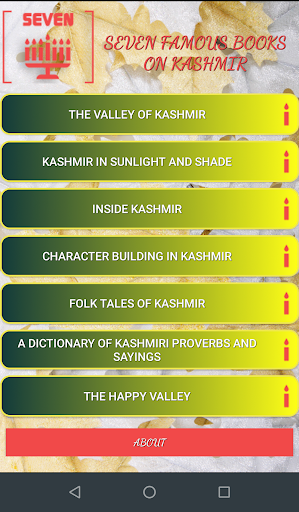 The app presents a collection of some of the most popular books on Kashmir authored by famous travelers, historians and social reformers of their times. The books provide insights in to the social and cultural aspects of the Kashmiri society, its evolution and the historical events that shaped its people. The books can be read in-app with pagination support, zoom, orientation and excellent display resolutions. The following seven books are part of the app: The Valley of Kashmir by Walter R. Lawrence (1895) Kashmir in Sunlight & Shade by C. E. Tyndale Biscoe (1922) Inside Kashmir by Prem Nath Bazaz (1941) Character Building in Kashmir by C. E. Tyndale-Biscoe (1920) Folk-Tales of Kashmir by Rev. J. Hinton Knowles (1888) A Dictionary of Kashmiri Proverbs & Sayings by Rev. J. Hinton Knowles (1885) The Happy Valley by W. Wakefield (1879) (All the books are openly available on Archives.org, without restrictions)