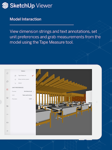 Bring 3D models to life on Android phones and tablets using SketchUp Viewer. Navigate and present your own SketchUp projects, or explore the millions of free models in 3D Warehouse for FREE! Explore, present, and communicate in 3D. Here’s how: • Open or download models directly from 3D Warehouse, Trimble Connect and Dropbox. You can also open models using Android\s ‘Open With’ feature, for example when opening .SKP files sent as email attachments. • SketchUp Viewer now supports Android\s Storage Access Framework, making it easy to open models from Google Drive and other file storage apps. • Augmented reality (AR) viewing features enable you to experience your 3D models by merging them with the world around you. AR model viewing features are available for all SketchUp Shop, SketchUp Pro and SketchUp Studio subscribers (also available via in-app purchase. $9.99 USD/yr.) • With the Select tool and Entity Info panel you are able to get information about edge lengths, the area of faces, volume of solids, and component and group definitions. • Navigate using multi-touch gestures for orbiting, panning and zooming. • Choose to view your projects from any of the standard views or Scenes that you may have created up in SketchUp’s desktop and web modelers.* • Switch between perspective and orthographic cameras for production and architectural drawings. • Take measurements using the Tape Measure tool and adjust unit preferences to see measurements, dimension strings and Entity Info in the units of your choice. • Turn layers on or off to control the visibility of parts of your model. • Control the look and feel of your model by adjusting Edge and Face styles, including X-ray mode, along with toggles to control the visibility of Hidden Geometry, Section Planes, Section Cuts, Axes, and Watermarks. • Move section planes to get just the right interior view of models, or visualize important elevation and plan views. * The app supports the following scene properties: Camera location and properties, Hidden Geometry, Shadow settings, Visible Layers, Active Section Planes, Standard Edge Styles, Face Styles, Background/Sky/Ground Style settings, Watermarks and Axes Location. For information and instructions, please visit: http://help.sketchup.com/en/mobile-viewer This app is recommended for Android phones and tablets running Marshmallow (6.0) or higher with a minimum of 1024Mb of RAM. The AR feature is designed to work on a wide variety of qualified Android phones running Nougat (7.0) or higher. A full list of supported devices is available in the following link: https://developers.google.com/ar/discover/supported-devices End User License Agreement; https://www.sketchup.com/license/b/sketchup-mobile-viewer