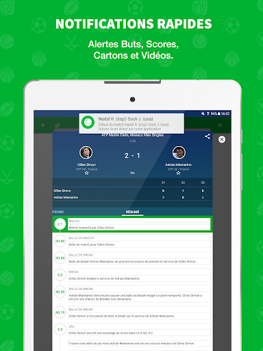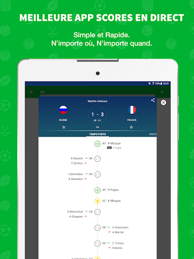 ★★★★★ Découvrez SKORES, l’application la plus complète et la plus simple pour suivre les scores en direct !★★★★★ La MEILLEURE APPLICATION de SCORES EN DIRECT pour suivre vos sports préférés ! RESULTATS EN DIRECT Suivez tous les scores en direct et recevez des alertes personnalisées sur les scores et les buts pour les équipes et matchs de votre choix. 10 SPORTS en direct Ne manquez rien des sports suivants : Football en live, Tennis, Basket, Rugby, Foot Américain, Baseball, Handball, Volley, Hockey. + DE 5000 COMPETITIONS Retrouvez les compétitions françaises et internationales de foot en direct, rugby, handball, volley, tennis, basket-ball, football américain, baseball et hockey ! LIVESCORE GRATUIT Suivez tous les résultats en direct et tous les sports sur votre mobile et ne manquez plus les résultats de vos équipes favorites ! Les autres points forts de « SKORES - Résultats en Direct Foot et 9 autres sports » sont : - Un Livescore plus rapide que les autres solutions de livescore - Alertes but et notifications sur l’évolution du score en direct - Résultats Foot en direct et 9 autres sports en live - Temps forts des matchs - Résumés de matchs - Statistiques sportives - Classement de toutes les compétitions - Calendrier des matchs à venir - Disponible sur Android et Wear OS Les sports en direct : Notre livescore couvre 10 sports en live et plus de 5000 compétitions ! Foot en direct et aussi Tennis, Basket, Volley, Rugby, Baseball, Handball, Foot Américain et Hockey en live. Des championnats français aux coupes et compétitions internationales, quel que soit le sport que vous aimez, vous pourrez suivre les derniers résultats. Amateurs de Foot en direct, testez-nous, notre service de livescore football est vraiment très complet ! Notre App utilise une technologie de scores en direct qui a fait notamment le succès des applications Sporty Trader ! Les autres Fonctionnalités de notre Application de Scores en Direct : - LIVESCORE : les résultats en direct - RESULTAT : tous les résultats en live des rencontres - ALERTES : notification de l’évolution du score en direct - CLASSEMENT : classements des tournois du monde entier de foot, basketball, tennis, volley, handball, rugby, hockey, baseball, football américain - CALENDRIER : programme des matchs disponibles pour le foot, basketball, tennis, volley, handball, rugby, hockey, baseball, football américain - RESUME : résumés commentés des matchs en live - STATISTIQUES : analyse des performances et stats de vos équipes et joueurs préférés - FAVORIS : définissez les alertes que vous souhaitez recevoir pour les équipes et les joueurs de votre choix Essayez-nous maintenant et découvrez le service de SCORES EN DIRECT GRATUIT le plus RAPIDE et le plus COMPLET!