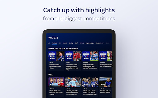 Get breaking news on the biggest stories, follow your favourite teams and sports, check live scores, and catch up with highlights from the biggest competitions. With a Sky Sports subscription, also watch the best live action with access to all Sky Sports channels. See what is happening in football, F1, cricket, boxing, golf, tennis, rugby league, rugby union, darts, NFL, racing, netball and more! FOLLOW YOUR FAVOURITES: Add your favourite teams and sports to your home screen, and get straight to the live streams, news, and highlights that matter most to you. WATCH SKY SPORTS LIVE: Got a Sky Sports subscription? Watch the biggest sporting events LIVE with access to every Sky Sports channel as well as additional streams, all directly within the app. Premier League, EFL, WSL, SPFL, F1, US Open tennis, ATP & WTA Tours, Super League, Lions Tour, The Open, The Masters, NFL, IPL, The Hundred, Premier League Darts, Netball - we have you covered! Ride onboard with our F1 driver cameras, switch between multiple tennis matches or watch football clips of key moments whilst enjoying the match live. Get closer to the action than ever before. ONLY in the Sky Sports app. If you are with Sky Mobile, you can also stream on the Sky Sports app without using your mobile data*. HIGHLIGHTS: Watch an unbeatable selection of videos including match highlights, news, interviews and analysis for FREE within the Sky Sports app. LIVE SCORES: Stay up to date with live scores for football, cricket, tennis, rugby league and rugby union, as well as live F1 times across all sessions of every Grand Prix. Please note: Live streaming and selected videos are only available in the UK and Ireland. Additional mobile network and/or WiFi charges may apply. To learn more about how Sky uses your data, see our privacy notice at https://www.sky.com/help/articles/privacy-hub-home Please read the terms and conditions carefully before using the app. *Requires active Sky Mobile airtime plan and at least 50Mb of data. Go to the Sky website for more information.