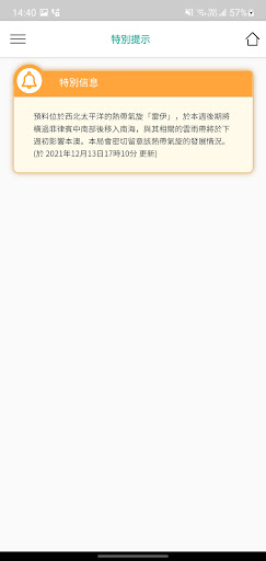 為了方便澳門居民及遊客掌握最新的澳門天氣資訊,澳門氣象局推出相關流動應用程式。無論身處世界的每一個角落,都可以更輕易、更靈活及更有效地取得澳門的天氣信息。設繁體中文、英文及葡文版供選擇。