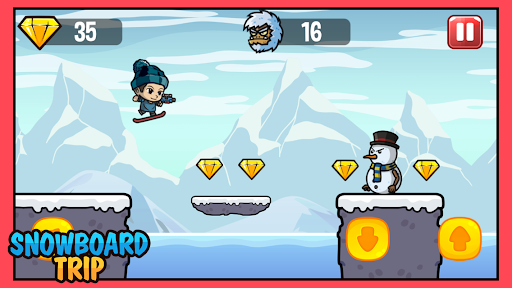 Snowboard Trip - Play in the snow, fight the monsters and survive by jumping and sliding to avoid traps and obstacles, use awesome power-ups and collect the diamonds , get the best score and have fun!