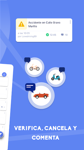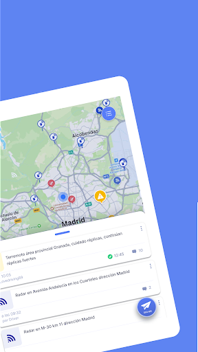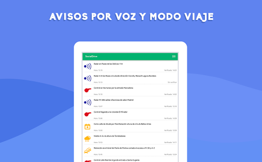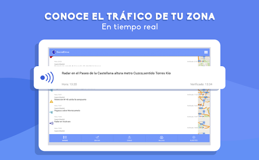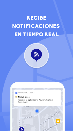 La red social de los conductores a tiempo real, 100% legal a través de la cual puedes informar y ser informado sobre radares, controles u otras incidencias de tu zona en cualquier punto de España. Una ayuda entre conductores para poder estar informados de lo que ocurre en la carretera. Informa al administrador si ves cualquier incidencia relacionada con la carretera y sé informado a través de notificaciones en tu teléfono móvil completamente gratis. Toda la información de tráfico recibida de usuarios es verificada por administradores de la App con el fin de que los avisos lleguen de manera eficaz a su zona correspondiente. ---------------------------- Características: • 100% ANÓNIMO: Sin necesidad de registro de usuario • VERIFICA Y CANCELA: Posibilidad de marcar verificación en el caso de que esa incidencia siga en el lugar de ese aviso, o marcar que ha finalizado • VÁLIDO PARA TODA ESPAÑA • SIEMPRE GRATIS (descargas, actualizaciones…) • NOTIFICACIONES A TIEMPO REAL: Advertencia a través de notificaciones en tu teléfono móvil de las zonas de las que quieras mantenerte informado (Opcional) • INFORMA Y MANTENTE INFORMADO. Puedes reportar y estar informado de radares móviles, controles de tráfico, retenciones, accidentes y todo tipo de incidencias de tráfico a tiempo real • NUEVAS ALERTAS. Ya puedes ver los radares fijos, radares de tramo y cámaras en semáforos en nuestra vista mapa --------------------------------------- SocialDrive ha trabajado con aplicaciones de parking, app de viajes como blablacar, multas con Legálitas y tráfico con DGT. Puedes encontrarnos en: - Web: socialdrive.es - Facebook: SocialDrive.es - Twitter: SocialDrive_es - Email para dudas, consultas o sugerencias: soporte@socialdrive.es *Rogamos encarecidamente detener el vehículo a la hora de utilizar la aplicación por su seguridad y la de los demás conductores
