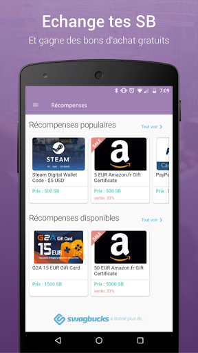 Gagne des bons d’achat GRATUITS plus rapidement en répondant à des enquêtes avec l\application de sondages rémunérés - Swagbucks. L\application de sondages rémunérés - Swagbucks te permet de gagner des points appelés «SB» en répondant à des sondages et en donnant ton avis sur les marques et magasins que tu connais. Plus de 18 millions de membres ont déjà échangé leur SB contre des bons d’achat d’une valeur de plus de 200 millions d’€ ! L\application de sondages rémunérés - Swagbucks est le moyen idéal pour étendre tes opportunités de gains partout où tu vas. Gagne des SB pour des bons d’achat gratuits en : - répondant à des enquêtes - nous parlant de toi - réalisant le sondage du jour - visitant des magasins physiques et en répondant aux sondages associés. Puis échange tes SB contre des bons d’achat Amazon disponibles à partir de 5€ ou du crédit PayPal. Pour plus de bons d’achat et des façons de gagner, visite Swagbucks.com sur un ordinateur fixe. Avis de non-responsabilité: l\utilisation continue du GPS en arrière-plan peut réduire considérablement la durée de vie de la batterie.