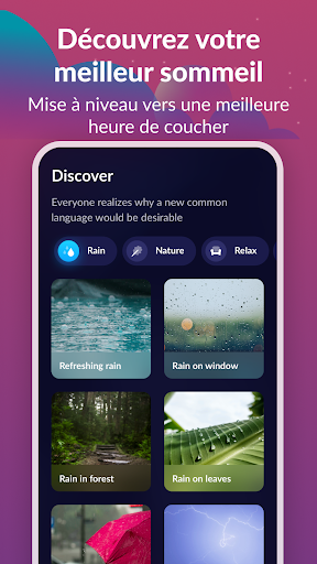 Fatigué de lutter contre l\insomnie, de lutter pour s\endormir ou de faire face à un partenaire qui ronfle ? Sleep Sounds vous aide à vous endormir rapidement avec des sons apaisants soigneusement sélectionnés qui vous feront dériver vers le pays des rêves en un rien de temps. Dites adieu aux nuits blanches et réveillez-vous en vous sentant rajeuni et rafraîchi. Les fonctionnalités incluent: Sons apaisants de haute qualité Voyages sonores interactifs et immersifs Ambiances personnalisables Conception simple et belle Minuterie de mise en veille pour une écoute facile Superbes images d\arrière-plan Installation pratique sur la carte SD Profitez hors ligne, pas d\internet requis Profitez de 12 sons de la nature personnalisables et réalistes : Pluie rafraîchissante Forêt Pluie Pluie de forêt tropicale Ruisseau vif Bois d\automne Soirée Plage Sons d\avion Sons des trains Pluie sur le pare-brise Bruits de la grotte Nuit apaisante Chalet d\hiver De plus, découvrez encore plus de sons d\écoute et d\expériences apaisantes : ASMR - Des sons uniques qui favorisent la relaxation et le confort Berceuses - Des mélodies apaisantes conçues pour faciliter l\endormissement Sound Journeys - Paysages sonores interactifs avec des histoires immersives Détendez-vous avec les sons du sommeil pour profiter : Meilleur sommeil Amélioration de la concentration tout au long de la journée Moins de stress et d\anxiété Des relations plus solides et plus encore Nous apprécions vos commentaires ! Si vous avez des commentaires ou des suggestions, veuillez nous contacter à contact@maplemedia.io