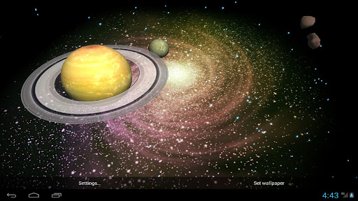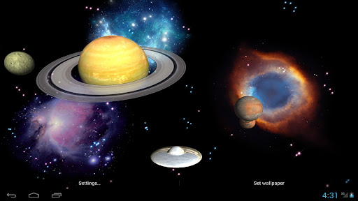This is a colorful space wallpaper for android which gives you the pleasure to make your own fun and beautiful cosmos and galaxies. Features: - Has 17 different 3D planets to choose (including the planet Earth and the Solar system planets) - Real Earth Moon, voyager and sputnik probes, futuristic space station, asteroid belt and a Ufo. - Move the camera using accelerometer and/or touch screen. - Many customizable effects: Nebula background, planet atmosphere and size, speed, light intensity, asteroids belt size, accelerometer. Creators: Delka Georgieva & Antonio Ruiz