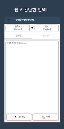 AI version of Speak Translator! Easy to use for free with a simple UI and screen. # Usage - Students studying foreign languages - Travelers traveling abroad - Users who want to check the simple dictionary meaning - Other users who need translation and interpretation # function - Speech recognition translation - Translation of words and phrases - Sentence and word translation using camera - Favorites - history # Supported languages : Korean, English