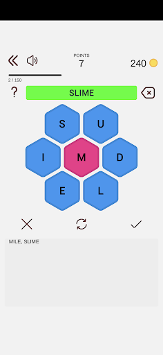 Spelling Bee is a game of letters whose goal is to find all the words that can be formed with 7 letters. - Only the letters available to form the word can be used. - It is not necessary that all the letter appear in the Word. Except the letter of the center that is mandatory. - Letters can be repeated. - Words must have a minimum of 3 letters. Spelling Bee Game Score: - The words of 3 letters give 1 point. - The 4-letter words give 2 points. - From 5 letters, so many points are obtained as letters have the floor. - If all the letters are used, 10 extra points are obtained. - The game ends when all the possible words are found.