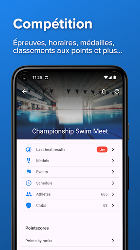 SPLASHME - VOTRE COMPAGNON POUR LES COMPÉTITIONS DE NATATION Profitez des résultats en temps réel, des mises à jour sur les compétitions, les événements, les séries et les attributions de couloirs, et bien plus encore. ÉVÉNEMENTS SUPPORTÉS SplashMe prend en charge tout événement géré par Splash Meet Manager de simrankings.net, largement utilisé dans les compétitions de natation en Europe et au Canada. Vérifiez votre prochaine compétition ou les événements à venir ici : https://www.swimrankings.net/index.php?page=splashmemeets FONCTIONNALITÉS COMPÉTITIONS EN DIRECT Suivez les compétitions de natation en temps réel avec des résultats et des mises à jour à la minute. FAVORIS Enregistrez vos nageurs favoris pour un accès rapide à leurs résultats et mises à jour. NOTIFICATIONS Recevez des alertes instantanées pour les mises à jour de vos compétitions et nageurs suivis. FONCTIONNALITÉS PRO COMPÉTITIONS PASSÉES Accédez aux données historiques et aux résultats des compétitions de natation passées. RECORDS Consultez les records de divers événements et nageurs. CLASSEMENTS Consultez les classements et les positions des nageurs du monde entier. ABONNEMENT REQUIS L\accès aux compétitions nécessite un abonnement. PRÉCISION DES DONNÉES Toutes les données (listes de départ et résultats) sont fournies par l\organisateur de l\événement, qui est responsable des mises à jour. DISPONIBILITÉ DES COMPÉTITIONS 20 jours avant : Les compétitions apparaissent Avec inscriptions : Jusqu\au début de la compétition Compétitions incomplètes : Jusqu\à la fin de la compétition Compétitions complètes : Jusqu\à 14 jours après la fin de la compétition POLITIQUE DE CONFIDENTIALITÉ ET CONDITIONS D\UTILISATION : https://www.swimrankings.net/index.php?page=terms