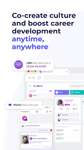 StarMeUp is the first behavioral-science-based, AI-enhanced platform that helps companies optimize their own culture. Without manipulations or rewards. We cultivate real culture with authentic experiences everyday. Leverage the power of our app to: • Send and receive 360° recognition in real time • Send and receive feedback to any employee no matter their role • Get valuable insights on human interactions and people’s mood from our website • Share photos and videos with your community • Hear everyone’s voice through surveys Our technology is for those who want to make a difference. Download it now Remember: in order to use StarMeUp your company must have contracted our service. Follow us on social media! Linkedin: www.linkedin.com/company/starmeup/ Instagram: www.instagram.com/starmeupos/ Facebook: www.facebook.com/starmeupos Twitter: www.twitter.com/StarMeUpOS Visit our website: https://os.starmeup.com/en.html Need help? Contact us at support@starmeup.com