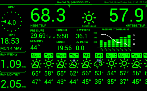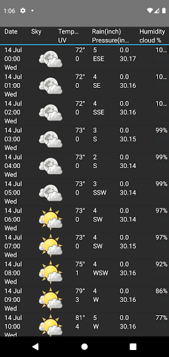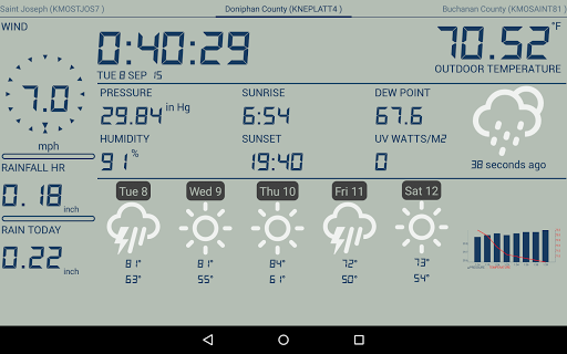 Station météo entièrement fonctionnelle * Température actuelle, prévisions horaires et quotidiennes, précipitations, pression, humidité, capteurs et cartes * Prend en charge à la fois les écrans HD grand écran et les écrans de téléphone * enregistre les données affiche des graphiques d\historique * Pression * Widget des conditions actuelles * Widget météo de prévision * Pluie * Humidité * Rayonnement solaire (si pris en charge par la station) * Vitesse et direction du vent * Mode sombre * Unités métriques et américaines standard * Prise en charge du capteur de température intérieure (Arduino, Netatmo & capteur de batterie, clientraw) * Capteur Android (pression, température, humidité et lumière) * Mise à jour automatique de la localisation par Wifi ou GPS * Lever et coucher de soleil * Widgets x4, écran de verrouillage * Horloge parlante et annonce météo * Fournisseurs de services pris en charge : Ambient Weather, Davis, NOAA, Weather Online, Open Weather Map, Yahoo Weather, BOM Australia, Norway Weather, Netatmo, Arduino (HTTP JSON), Mesowest et ClientRaw, PWS (abonnement uniquement). * Température intérieure basée sur Arduino, capteur d\humidité de pression Si vous rencontrez des difficultés avec le fonctionnement de l\application, veuillez essayer Paramètres Android > Gestionnaire d\applications > Station météo > Effacer les données Cela efface toute la configuration et, espérons-le, restaurera l\application dans un état de fonctionnement. Vous devrez peut-être également supprimer le widget de l\écran d\accueil et l\ajouter à nouveau. Si vous souhaitez essayer la version bêta, appuyez sur le bouton \Devenir testeur\ sur https://play.google.com/apps/testing/com.arf.weatherstation. Après cela, une mise à jour sera disponible via Google Play. Des questions, des commentaires ou des rapports de bogues ? Les commentaires sont les bienvenus, envoyez-les simplement à dromosys@gmail.com ou utilisez le formulaire de demande d\assistance dans l\application. Autorisations : gps - configuration automatique de la localisation wifi - communication avec le service météo stockage - importer/exporter les préférences de l\utilisateur