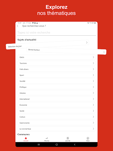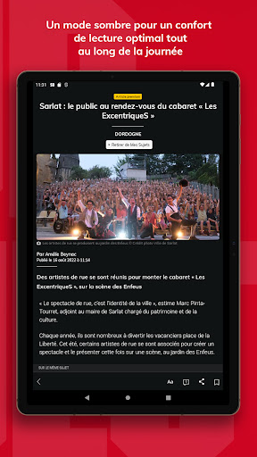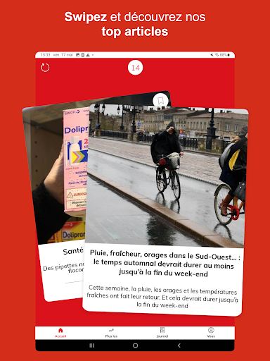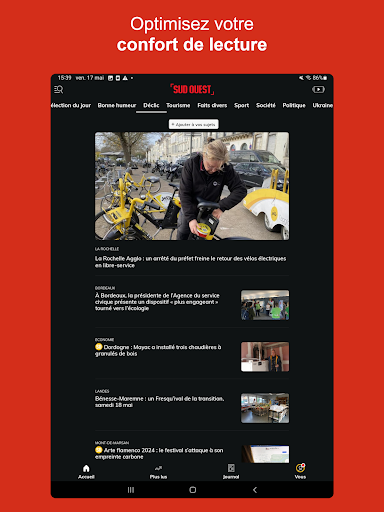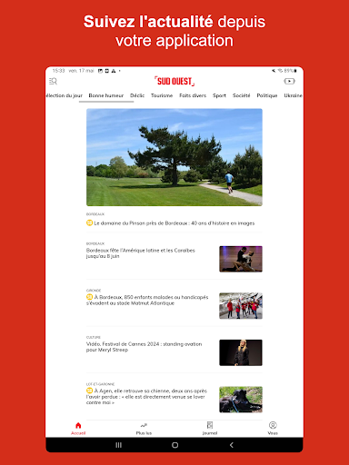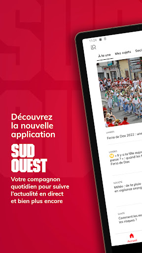 Découvrez notre application Sud Ouest gratuite et retrouvez en continu et en temps réel toute l’actualité locale et exclusive de votre région, mais aussi l’actualité nationale et internationale. ■ Grâce aux fonctionnalités de l’application Sud Ouest, vous pouvez : *Découvrir l’actualité en direct et par thématique *Personnaliser votre fil d’actualité dans l’onglet « Vos sujets » *Enregistrer des articles et les ajouter en favoris pour les lire plus tard *Découvrir les 20 articles les plus lus de chaque jour *Optimiser votre confort de lecture en passant en mode sombre et en modifiant la taille de la police *Rester informé sur les sujets et actualités de votre choix en temps réel, tout au long de la journée et en fonction de votre localisation grâce aux notifications thématiques *Participer aux différents débats avec les autres lecteurs et journalistes *Connaître l’agenda de votre région et les différents événements qui se passent autour de vous grâce à notre billetterie *Découvrir la diversité de nos contenus multimédias avec nos podcasts, nos vidéos et notre chaîne de télévision TV7 ■ Vous pourrez suivre l’ensemble de l’actualité : * des principaux départements de la Nouvelle Aquitaine : Gironde, Charente-Maritime, Dordogne, Lot-et-Garonne, Landes, Pyrénées-Atlantiques pour suivre toutes les informations régionales et départementales * des principales villes de la Nouvelle Aquitaine : Bordeaux, La Rochelle, Pau, Bayonne, Angoulême, Agen, Périgueux, Dax, Biarritz, Mont-de-Marsan et des 3600 villes et communes couvertes par la rédaction * décryptée par thème : politique, économie, international, justice, faits divers, culture, environnement et climat, les news de société et de santé mais aussi toute l’actualité sportive avec le rugby, le football, le tennis, le golf et tous les grands rendez-vous tout au long de l\année comme le Top14, l’Euro 2024, le Tour de France et bien sûr les Jeux Olympiques de Paris 2024 * l’actualité de vos clubs préférés et les résultats des équipes locales : UBB, Girondins de Bordeaux, Les Boxers, Stade Montois, Biarritz Olympique, Section Paloise, Stade Rochelais, US Dax, Boulazac Basket Dordogne, Biscarrosse Olympique Basket et bien plus encore. * avec des sélections d\articles et contenus de la rédaction comme les articles Insolite, Bonne humeur, l\instant Chocolatine, le Vrai du Faux et la sélection du jour ■ S’abonner à Sud Ouest, c’est : * Accéder à l’intégralité de nos articles en illimité * Découvrir des articles d’analyse et de décryptage en formats longs et dossiers * Lire l\édition du soir dès 19h du lundi au vendredi * Profitez d’une expérience de lecture optimale avec une publicité limitée * Consulter le journal numérique dès 5h * Retrouver tous les magazines en format numérique : Sud Ouest Week-End, Diverto et Femina * Explorer nos suppléments offerts aux abonnés sur le tourisme, le sport, l\économie, où sortir dans la région (actuellement retrouvez le guide été et les suppléments sur l\UBB) Mais aussi, soutenir l’engagement d’une rédaction de proximité de plus de 250 journalistes >> Abonnez-vous à partir de 9.99€, 100% numérique et sans engagement. ■ Vous aimez Sud Ouest ! Récompensez le travail de l’équipe en notant l’application sur le store *****