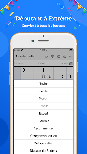 Jeu de puzzle sudoku professionnel Tous les puzzles sont testés par programme Convient aux débutants et aux experts Graphiques clairs et fonctions riches Rivaliser avec un expert sudoku du monde entier Sudoku est un jeu de logique dans lequel vous devez combiner des nombres. Ce jeu de Sudoku est gratuit est probablement l\un des parfait et le génie que vous trouverez. Ce jeu gratuit vous aidera à apprendre et à améliorer vos compétences en Sudoku pour devenir un génie Sudoku. Le Sudoku vous fait réfléchir! Vous pouvez télécharger l’appli Sudoku gratuite pour votre smartphone Android ou votre tablette. Vous aurez accès à + de 15000 sudoku stimulants pour entraîner votre cerveau tous les jours, et nous ajoutons 100 nouvelles grilles de sudoku toutes les semaines. Sudoku pour les débutants comme les joueurs expérimentés ! Chaque Sudoku n’a qu’une seule véritable solution. Sudoku Classique est le meilleur jeu de réflexion pour votre cerveau, votre logique, votre mémoire et un excellent passe temps! Bienvenue dans Sudoku World! Entraînez votre cerveau maintenant! Fonctions principales: 1. Plus de 50000 puzzles de sudoku(6x6, 9x9, 16x16), tous testés par programme 2. Du débutant à l\expert, qui conviennent à tous les joueurs 3. Relevez le défi quotidien et affrontez des experts du monde entier 4. L\indice intelligent vous montre les étapes de la réflexion et explique comment trouver un nombre correct pour une cellule 5. Appuyez longuement sur un numéro, verrouillez-le et utilisez-le pour plusieurs cellules. Vous pouvez l\activer dans les paramètres 6. Résolvez les énigmes et gagnez 190 trophées 7. Les niveaux de jeu incluent 9000 puzzles, qui vont du débutant à l\expert 8. Activez le mode Notes pour prendre des notes comme sur du papier. Chaque fois que vous remplissez une cellule, les notes sont automatiquement mises à jour ! 9. Surlignez les doublons pour éviter de répéter des nombres dans une rangée, une colonne et un bloc 10. L\éditeur de Sudoku et le solveur de Sudoku vous aident à créer vos propres puzzles 11. Thèmes de couleurs. Choisissez l\une des trois apparences pour un meilleur confort de jeu, même dans le noir Plus de fonctions: - Classement par points, vous pouvez rivaliser avec des experts de sudoku du monde entier - Annulations illimitées. Vous avez fait une erreur ? Revenez en arrière rapidement - Sauvegarde automatique. Si vous ne finissez pas un puzzle, il sera sauvegardé. Continuez à jouer à tout moment - Surlignage d\une ligne, d\une colonne et d\un bloc liés à la cellule sélectionnée - Prise en charge des téléphones et des tablettes - Excellent effet sonore Merci d\avoir choisi HangXun Sudoku Game! Nous ferons de notre mieux pour rendre le jeu de mieux en mieux.
