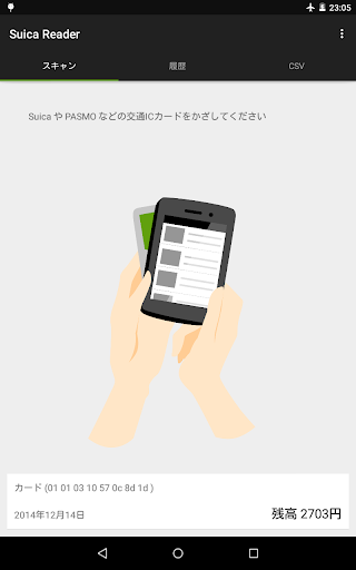 Suica や PASMO などの交通系ICカードリーダーの乗車履歴を表示するアプリです。 Edy、nanaco も読むことが出来ます。 以下のページにQ&Aをまとめました。 http://www.yanzm.net/suica_reader.html * CSVエクスポート機能の購入で問題がある方は個別に対応いたしますので、anzai.y.aa@gmail.com までご連絡ください。よろしくお願いします。 * PiTaPaはポストペイなので、チャージして利用する場合以外は0円で表示されます。 * 交通系ICカードはNFCタグとはデータ構造が違うため読み取りにくくなっています。 * モバイル Suica に対応しています。 * 定期情報は見れません。(定期以外につかっていない場合読み取りに失敗します。) * Android 2.3.3 以上 * 端末が NFC に対応している必要があります。 * 履歴をアプリ内に保存できます。 * バスの場合、会社名を表示します(カード内のデータに路線番号・駅番号が含まれていないため会社名の表示のみになります)。 * 駅名修正依頼機能を追加しました! 履歴のリストで、修正したい駅名の項目を長押しすると、修正依頼ダイアログが表示されるので、 正しい駅名と路線を入力してください。 ■アンドロイダー詳細ページ https://androider.jp/official/app/4e0d8734b16c75cd/ ※SuicaはJR東日本の登録商標です。 ※PASMOは(株)パスモの登録商標です。