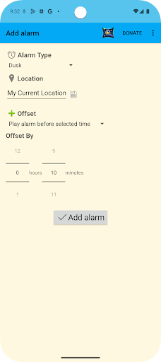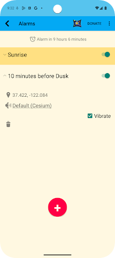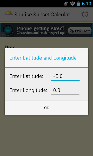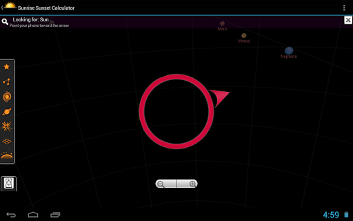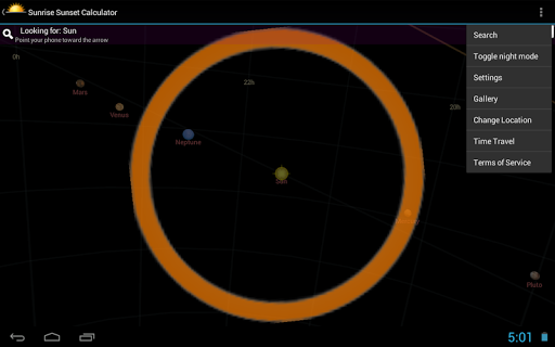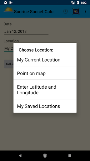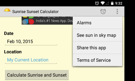 La calculatrice Sunrise Sunset est une application qui vous permet de trouver les horaires suivants pour soit votre emplacement actuel ou un endroit donné sur la terre: 1) Lever et coucher du soleil 2) Aube et Crépuscule civil 3) Aube et Crépuscule nautique 4) Aube et Crépuscule astronomique Le calcul est effectué en utilisant les formules à http://www.edwilliams.org/sunrise_sunset_algorithm.htm. A noter que depuis ces formules ne tiennent pas compte de l\altitude du lieu, les valeurs calculées peuvent être légèrement inexacts pour les lieux bien au-dessus du niveau des mers. The web version of the app, which does not currently have the alarms and sky map features that are present in the Android app version, can be accessed at https://sunrise-sunset.multisocialshare.com/