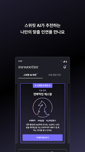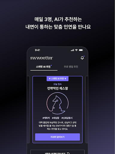 모든 인연의 시작은 하나의 실에서부터 시작돼요. 우리는 AI캐릭터 ‘스위핏’과의 대화로 알게된 당신의 성격, 경험을 토대로 한 가닥 한 가닥 정성스럽게 실을 엮어 하나의 멋진 이야기로 만들어요. 당신의 이야기로부터 시작된 실은 수 많은 인연들의 이야기를 만나며, 마침내 하나의 인연의 실로 맺어지는 경험을 선사 할 거에요. 이 엮임의 끝이 스웨터처럼 따뜻하고 달콤할 수 있도록 스위터가 함께할게요. 스위터 홈페이지: https://swweetter.ai 스위터 인스타그램: @swweetter.ai 문의사항: aboutmeeting.official@gmail.com