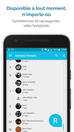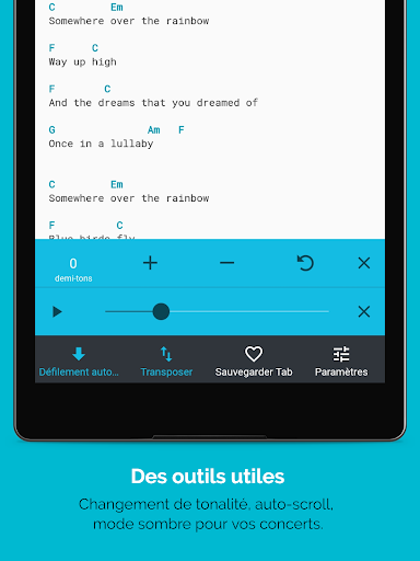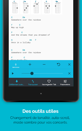 Nous sommes la plus grande base de données de tabs et accords pour ukulélé au monde. Des milliers de joueurs nous font confiance et participent à notre App. Apprenez à jouer vos chansons favorites n\importe où, quand ça vous chante. Installez l\applicaiton pour Ukulélé le plus téléchargée de la planète! Créée par des ukulélistes, pour ukulélitses. Explorez plus 100,000 tabs ====================== ✓ Recherchez rapidement des chansons, artistes ou albums, ✓ Filtrez par genre, difficulté, pays, les plus sauvegardées ou tabs les plus populaires ✓ Découvrez des chansons au hasard Options Utiles ============ ✓ Editez les tabs existantes selon vos besoins – votre version personelle sera seulement visible par vous! ✓ Affichez les tabs en mode portrait ou paysage ✓ Accès direct à nos App complémentaires: un Accordeur de Ukulélé et un dictionnaire d\accords (GRATUIT) ✓ 20 battements d\accords les plus connus ✓ Activez le défilement automatique lorsque vous jouez ✓ Changez facilement la tonalité d\une chanson ✓ Profitez du mode nuit le soir ou pendant un concert ✓ Informations détaillées sur les chansons ✓ Des nouvelles pages artistes Synchronisez & Sauvegardez ! ================== ✓ Accédez à votre historique, même hors-ligne ✓ Synchronisez et sauvegardez votre songbook avec le site (compte membre nécessaire – GRATUIT) ✓ Songbook disponible pour une consultation hors-ligne Ajustez VOS paramètres ==================== ✓ Mode Droitier/Gaucher ✓ Selection de l\accordage par défaut : Standard (gCEA - Soprano), G-Tuning (DGBE - Baryton) , D-Tuning (ADF#B) or Slack-Key (GCEG) ✓ Modifiez la police et la taille des caractères ✓ Surlignez les accords dans une couleur spécifique ✓ Epinglez les accords en haut lors du scroll vertical ✓ Empêchez la mise en veille de l\écran lorsque vous jouez, ✓ Activatez le mode \économie de bande passante\ si votre connexion internet est lente ✓ Adaptez les tabs à l\écran ou utorisez le débordement de texte Participatez/Contribuez ================== ✓ Rejoignez la plus grande communauté de joueurs de Ukulélé au monde ✓ Notez, commentez et faites des amis ✓ Consultez les profils des autres membres ✓ Gérer votre compte Supprimez les pubs... c\est GRATUIT! =================== ✓ Profitez d\une expérience sans publicité originale : regardez des vidéos, gagnez des points et supprimez les pubs quand vous voulez Envie de plus de tabs dans votre langue? Pour ajouter des tabs/accords, merci de visiter ukulele-tabs.com. Photo d\Aerosmith sur la cature d\écran par Daigo Oliva, sous licence CC BY-SA 2.0: http://www.flickr.com/photos/11671827@N00/457439106/