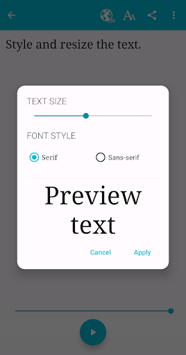 With Talk, your phone will speak what you type. Make your phone say anything you want in many languages! Let your phone read the news for you! It supports importing web pages directly from the browser to listen to them. You can also import text from any other apps. Features: - Text to voice - Read web pages - Play / Pause / Stop - Export audio as WAV file - Lots of languages (internet connection required for some) Uses: - Reading news or books - Helpful for visually impaired people - Helpful for speech impaired people - Helpful for people that had wisdom teeth removed - Fun There\s a paid version available WITHOUT ADS here: https://play.google.com/store/apps/details?id=com.abast.talkpro NOTE: Your phone must have a Text-to-Speech enginge for Talk to work. If it doesn\t have it you can download it from Google Play. Depending on the TTS engine, some languages that appear in the app may not work. G+ community: https://plus.google.com/communities/107986392540899459664