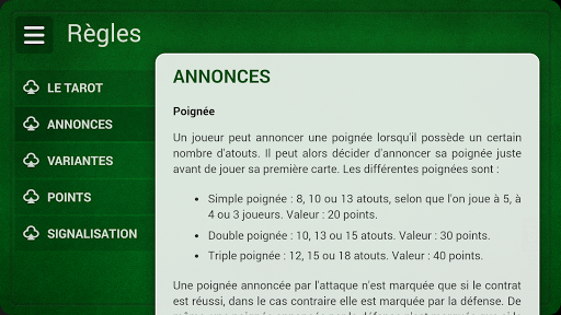 *** JOUEZ AU TAROT SUR VOTRE SMARTPHONE OU TABLETTE ANDROID *** Jouez au Tarot à 3, 4 ou 5 joueurs contre des adversaires simulés par une intelligence artificielle de haut niveau. Fidèle au jeu de carte, toutes les règles sont respectées : - Tarot à 3, 4 ou 5 joueurs. - Possibilité d\annoncer un chelem. - Gestion du petit au bout. - Gestion des poignées. - Gestion des misères. - Prise en compte de la signalisation FFT. Jouez seul contre une IA avancée, sur des parties standards, en mode Duplicate ou via un mode entraînement vous permettant de choisir le type de donne à jouer (jeu d\attaque, de défense, de garde contre, etc...). *** DES GRAPHISMES HD *** Prise en main facile, jeu fluide et rapide, avec animations pour une ambiance réaliste, le tout avec un design soigné. *** UNE INTELLIGENCE ARTIFICIELLE AVANCEE *** Votre partenaire ainsi que vos adversaires sont dotés d\une intelligence artificielle avancée, et maîtrisent les principales stratégies du Tarot, et notamment les principes de la signalisation. Plusieurs niveaux de difficulté sont disponibles, de débutant à expert. Les parties sont donc très réalistes, et proposent un réel challenge. *** UNE APPLICATION HAUTEMENT PERSONNALISABLE *** De nombreuses options de personnalisation des règles de la belote ou de l’interface de jeu sont disponibles : - Possibilité d\autoriser ou non les misères. - Possibilité de choisir la vitesse du jeu. - Possibilité de jouer ou non avec la petite. - Jeu automatique lorsque l’on n’a qu’une carte à jouer. - Sens de jeu. - Et beaucoup d’autres... *** UNE APPLICATION QUI VOUS PERMETTRA DE PROGRESSER *** Un mode entraînement permettant de jouer des types de donnes prédéfinis (jeu de garde contre, de chasse du petit...) est intégré à l\application. Une section statistiques est incluse dans l\application, vous permettant de suivre l\évolution de vos performances. Pour ceux qui débutent, une section expliquant les règles du Tarot est également intégrée à l\application. Enfin, vous avez la possibilité à la fin d\une donne de revoir tous les plis, et éventuellement de rejouer la donne, pour tenter de nouvelles choses. Pour toute question / suggestion sur l\application : support.tarot@eryodsoft.com Du même éditeur : Belote, Rami, Coinche, Dame de Pique Bon Tarot !