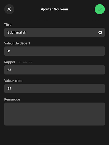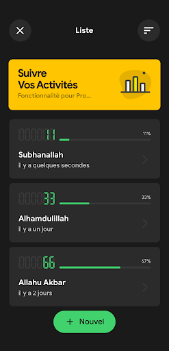 Avec Tasbih Counter Pro, publié comme version avancée de l\application Tasbih Counter Lite, vous pouvez facilement compter vos tesbihat et dhikrs sur votre téléphone partout. Vous pouvez sauvegarder vos dhikrs et reprendre les dhikrs précédemment sauvegardés là où vous les aviez laissés. Les dhikrs sont enregistrés sous ; nom du dhikr, nombre de dhikrs, note, cible, et valeur restante. Les dhikrs enregistrés peuvent être triés en fonction du nom, de la date et de la valeur du compteur. Même si l\application Tasbih (Misbaha) est fermée et ouverte de nouveau, le compteur de dhikrs continue à partir de la dernière valeur restante. Le compteur de dhikrs est réinitialisé uniquement lorsque le bouton « Réinitialiser » est utilisé. Si vous vous connectez à l\application Tasbih Pro avec un compte Google, les dhikrs et autres préférences enregistrés sont sauvegardés sur le serveur à distance. Ainsi, lorsque vous passez à un nouveau téléphone, le compteur tasbih numérique en ligne restaurera les dhikrs enregistrés, et les dhikrs précédents ne seront jamais perdus. Tasbih Counter Pro prend en charge le turc (Zikirmatik), l\anglais (Tasbeeh), l\indonésien (Tasbih), l\arabe (المسبحة, مِسْبَحَة, سُبْحَة, تَسْبِيح), le russe (тасбих), le malais, le français et l\allemand. Fonctionnalités • Liste recommandée de tasbih et de dhikr. • Enregistrez et archivez les dhikrs. • Définissez la rappel et la valeur cible pour Tasbih Pro. • Activités, tableau et détails d\utilisation. • Sauvegarder vos dhikrs avec un compte Google. • Possibilité de compter les dhikrs sans regarder l\écran grâce au toucher dynamique. • Utilisation agréable avec prise en charge du mode nuit. • Option d\interface simplifiée avec mode d\utilisation privé. • Possibilité de créer des thèmes personnels grâce au générateur de thèmes. • Thèmes conçus avec support de fond d\écran. • Notification de vibration et de son pour le bouton du compteur. • Sons alternatifs pour appuyer sur le bouton dhikr. • Compteur tasbih sans publicité avec achat intégré. Confidentialité : https://tasbih.app/privacy Conditions : https://tasbih.app/terms
