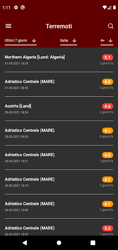 App che visualizza informazioni dettagliate in tempo reale riguarda i Terremoti avvenuti in Italia e nel Mondo. Questa App è offerta gratuitamente e senza annunci pubblicitari Caratteristiche: Lista dei terremoti avvenuti per una determinata ricerca selezionata dall\utente Mappa del terremoto con la posizione esatta Il magnitudo, data, ora, profondità e zona dell’evento La possibilità di effettuare ricerche dettagliate a partire dal 1985 La ricerca dei terremoti può essere eseguita in due modi differenti: Dalla home page combinando i valori dei parametri presenti a scelta dell’utente. Non richiede alcun permesso. Dalla pagina di ricerca personalizzata combinando la Zona con il magnitudo oppure il Raggio con il magnitudo. Con la Zona si intende uno dei valori tra Italia, Europa e Mondo. Anche questa opzione non richiede alcun permesso. Con il Raggio si intende l’area circoscritta con il centro la posizione dove si trova l\utente in quel momento. Questa opzione ovviamente chiede il permesso della posizione e verrà richiesta solamente se si effettua questo tipo di ricerca. Dalla versione 1.2.0 sono disponibili anche le notifiche. Di default sono disattivate, quindi bisogna attivarle se si vuole rimanere aggiornati in tempo reale sui possibili nuovi terremoti (appena vengono pubblicati). Non è richiesto alcun permesso all\utente