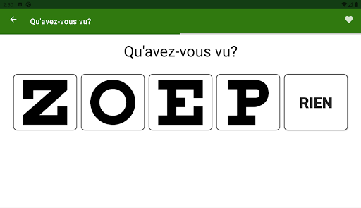 Votre vision est-elle bonne? Pour le vérifier, rien de mieux qu\un petit test! Prenez soin de votre vision. Avec ce test visuel, vous pouvez tester votre acuité visuelle à domicile. Ce programme ne peut se substituer à l\avis d\un ophtalmologiste, mais avec ce test de vision vous pouvez découvrir que votre vue se détériore et vous avez besoin de consulter un médecin. 90% de l\information que reçoit votre cerveau est visuelle. Voilà pourquoi soins de la vue est si important. Les avantages de ce test de la vue est qu\il est facile à utiliser. Vous pouvez également planifier prochain examen de la vue (quotidienne ou hebdomadaire). Processus: - Assurez-vous que vous êtes dans une position confortable - Assurez-vous qu\il n\y a pas de reflet sur l\écran du téléphone. - Placez votre téléphone à environ 40 cm / 16 pouces de vos yeux. Pendant le test, vous verrez différents objets. Essayez d\identifier l\objet montré. La séquence d\objets est aléatoire. Caractéristiques: - Tableaux optique: Diagramme de Snellen, Landolt \C\, Tumbling E, tableau avec photos pour les petits enfants - Objet sont présentés au hasard AVERTISSEMENT: Ce programme ne peut se substituer à l\avis d\un professionnel de la santé légalement habilité, tel qu\un médecin. DISCLAIMER: This application is not intended to replace optician\s regular full examination. We recommend you get a full eye test after using it.