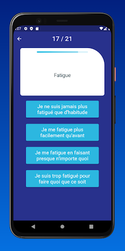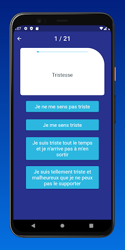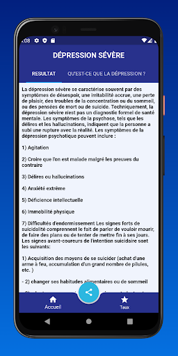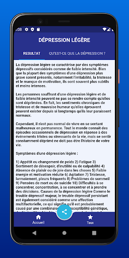Test de Dépression & Suivi de l\Humeur Scientifiquement Validé Découvrez votre bien-être émotionnel avec notre application Test de Dépression & Suivi de l\Humeur, cliniquement prouvée et basée sur l\inventaire de dépression de Beck (BDI). Cet outil puissant vous aide à comprendre et surveiller votre santé mentale, offrant des insights précieux dans votre parcours vers l\équilibre émotionnel. Évaluation BDI Complète • Passez le test validé de 28 questions de l\inventaire de dépression de Beck • Interface conviviale pour une expérience fluide • Évaluez précisément votre état émotionnel actuel Résultats et Interprétation Instantanés Obtenez un retour immédiat sur votre niveau de dépression : • Dépression minimale • Dépression légère • Dépression modérée • Dépression sévère Comprendre votre état actuel est la première étape vers l\amélioration. Calendrier de Suivi de l\Humeur • Enregistrez quotidiennement votre humeur et vos symptômes • Identifiez les déclencheurs pour une meilleure gestion de la santé mentale Conseils et Insights Personnalisés • Recevez des conseils adaptés basés sur vos résultats de test • Apprenez des stratégies d\adaptation efficaces • Améliorez votre bien-être mental avec les conseils d\experts Suivi des Progrès • Repassez le test BDI à intervalles réguliers • Suivez l\amélioration de votre santé mentale au fil du temps • Restez motivé dans votre parcours vers une meilleure santé émotionnelle Ressources Éducatives • Accédez à des informations sur la dépression, les symptômes et les options de traitement • Restez informé et autonome dans votre parcours de santé mentale • Apprenez grâce à du contenu sélectionné par des experts Confidentialité et Sécurité • Cryptage de pointe • Mesures de confidentialité strictes • Vos données sensibles de santé mentale restent confidentielles et sécurisées Exportation et Partage • Exportez facilement les données d\humeur et les résultats des tests • Partagez les informations avec votre professionnel de santé • Améliorez vos discussions de traitement avec des données précises Pourquoi Choisir Notre Application Test de Dépression & Suivi de l\Humeur ? Scientifiquement Validée : L\inventaire de dépression de Beck est un outil respecté et cliniquement prouvé pour évaluer les symptômes de dépression. Design Convivial : Interface intuitive pour une navigation facile et une évaluation rapide. Approche Globale : Combine évaluation, suivi, éducation et insights personnalisés pour une gestion holistique de la santé mentale. Mises à Jour Régulières : Notre équipe de professionnels de la santé mentale et de développeurs améliore continuellement l\application avec les dernières recherches et fonctionnalités. Comprendre votre santé mentale est crucial pour le bien-être général. Que vous gériez le stress quotidien, que vous ressentiez des symptômes de dépression ou que vous mainteniez une bonne santé mentale, notre application est votre compagnon fiable. Rappel : Bien que cette application soit un outil précieux d\auto-évaluation et de suivi, elle ne remplace pas l\avis médical professionnel. Si vous ressentez des symptômes sévères ou avez des pensées d\automutilation, veuillez chercher immédiatement l\aide d\un professionnel de santé mentale qualifié ou contacter les services d\urgence. Téléchargez maintenant et faites le premier pas vers une meilleure compréhension et gestion de votre santé mentale. Votre voyage vers le bien-être émotionnel commence ici ! Téléchargez maintenant et commencez votre voyage vers une meilleure santé mentale !