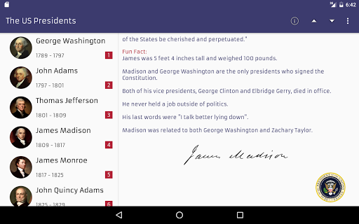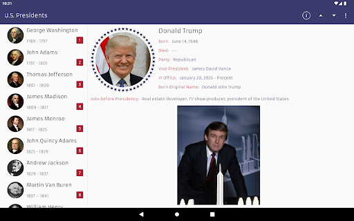 From the American revolution leader to the modern 21st century leader, Check out their biography offline, and even more detail online from Wikipedia. Features: • Brief information and more detail biography • Deeper detail wikipedia online information • Include presidents best quotes and fun fact • Also understand president born date, died date, born name, in office year, vice president name, jobs before and after presidency • View presidents portrait in fullscreen • Direct search images and view YouTube videos • Nice layout design