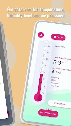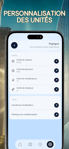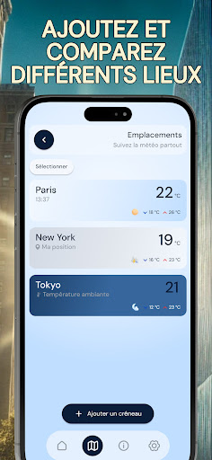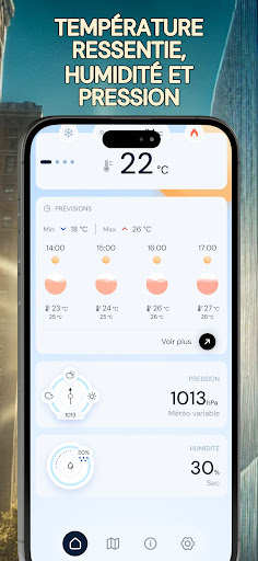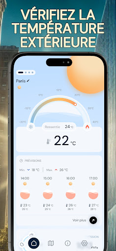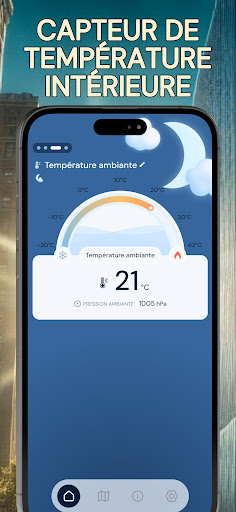 Obtenez des données météorologiques précises en temps réel, où que vous soyez, grâce à l’outil de mesure de température ambiant complet et précis Thermomètre. Cette application offre une variété de fonctionnalités permettant de mesurer la température extérieure en temps réel, mais aussi la température intérieure et apparente, le taux d\humidité et la pression atmosphérique grâce à la géolocalisation et aux capteurs, offrant ainsi des données fiables. Vous pouvez également enregistrer et comparer les températures de différentes localisations en même temps, pour connaître les prévisions météo de votre lieu de résidence, de celui de vos proches ainsi que celles de votre prochaine destination de voyage. Utilisez la géolocalisation automatique pour obtenir une température de l\air extérieur très précise de l\endroit où vous vous trouvez, où que vous soyez. Si vous ne souhaitez pas autoriser la géolocalisation, il est également possible de saisir manuellement la ville dont vous souhaitez connaître la température extérieure. Utilisez aussi directement les capteurs de votre téléphone pour obtenir la température ambiante grâce à notre outil d\intelligence artificielle. Grâce à l’application Thermomètre, disposez de données précises issues d’OpenWeatherMap vous permettant de planifier vos activités en extérieur telles que la randonnée, le camping, et le ski en toute confiance. Ces informations vous aideront également à naviguer dans les conditions climatiques changeantes et parfois extrêmes du Canada. Thermomètre vous permet également, grâce à sa nouvelle version, de vous préparer aux températures extrêmes grâce à des alertes température. L\application est personnalisable avec plusieurs options d’arrière-plans et d\unités (celsius ou Fahrenheit) pour vous permettre de personnaliser l\affichage selon vos préférences. Elle s\adapte à tous les types de téléphones et tablettes, et est traduite dans votre langue pour une expérience utilisateur unique et confortable. Ne laissez plus les conditions météorologiques vous surprendre, téléchargez dès maintenant l\application de température Thermomètre en Anglais et Français ! Partagez, notez et commentez !