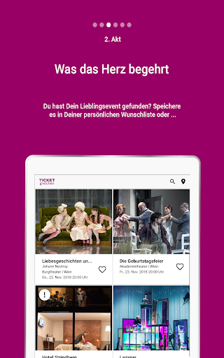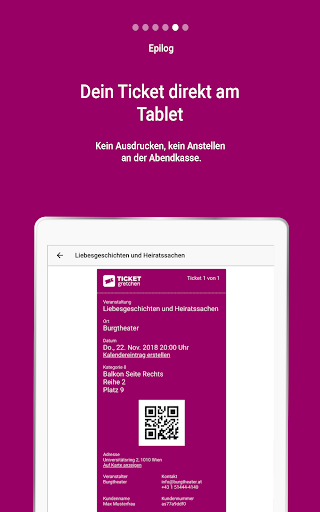 Die Ticket Gretchen App bringt Dich einfach, schnell und garantiert zum Originalpreis zu den spannendsten Kultur-Events! Unser Motto: Ohne viel Theater ins Theater! 1. Akt: Ticket Gretchen App kostenlos laden! 2. Akt: Alle Kultur-Highlights Deiner Stadt auf einen Blick! 3. Akt: In 30 Sekunden zu Deinem Ticket! Das schnellste Kultur-Ticket Österreichs • Alle Informationen zu Veranstaltungen: Fotos, Videos, Werkbeschreibungen, Pressestimmen, u.v.m. • U27 - das günstige Kulturticket für alle unter 27 • Wunschliste zum Speichern von Lieblingsevents • Ticketauswahl direkt im mobilen Saalplan • Noch schneller: registrierungsloser Kauf • Ticketbenachrichtigung für ausverkaufte Stücke • Service-Alerts für Premieren, auslaufende Stücke, etc. • Teilen von Veranstaltungen mit Freunden • Sichere Zahlung mit Kreditkarte • Buchungsbestätigung mit automatischem Kalendereintrag • Elektronisches Ticket, Passbook (Wallet) oder Print@home Jetzt App laden & Kulturevents in deiner Nähe entdecken! Aktuell auf dem Spielplan Wien: • Akademietheater • Burgtheater • Kammerspiele der Josefstadt • Kasino am Schwarzenbergplatz • Kunst & Kultur im Stephansdom • Musiktheatertage Wien • Oper in der Krypta • Renaissance Theater • Rote Bar im Volkstheater • Theater Akzent • Theater im Zentrum • Theater in der Josefstadt • Vestibül • Volksoper • Volkstheater • Volx • Wiener Staatsoper • WUK performing arts Burgenland: • jOPERA • Schloss-Spiele Kobersdorf • Seefestspiele Mörbisch • Steinbruch St. Margarethen • HERBSTGOLD - Festival in Eisenstadt • classic.Esterhazy Salzburg: • Bachchor • Camerata Salzburg • Internationale Stiftung Mozarteum • Kulturvereinigung Salzburg • Mozarteumorchester • Osterfestspiele • Salzburger Festspiele • Salzburger Landestheater • Schauspielhaus Salzburg Tirol: • Akademie St. Blasius • Haus der Musik Innsbruck • Tiroler Festspiele Erl • Tiroler Landestheater & Symphonieorchester Innsbruck • Innsbrucker Festwochen der Alten Musik • Meister & Kammerkonzerte • Osterfestival • Innsbruck International • Universitätschor Innsbruck Vorarlberg: • Vorarlberger Landestheater • Symphonieorchester Vorarlberg Steiermark: • Styriarte Oberösterreich: • Landestheater Linz • Brucknerorchester • Kirch\Klang Festival Fragen, Wünsche, Anregungen? Wir freuen uns auf Deine Nachricht: support@ticketgretchen.com Ticket Gretchen wünscht Dir gute Unterhaltung!