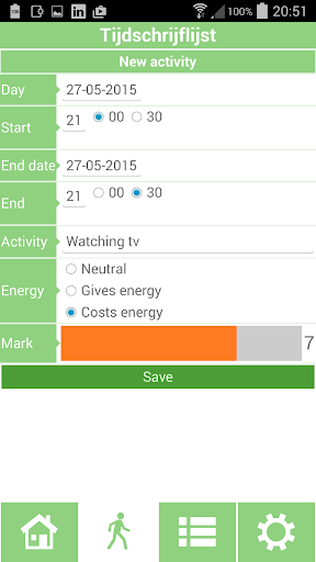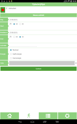This is a digital timekeeping list, with which you can keep up with your activities during the day. You can fill in if the activities cost energy or deliver energy and what your energy level is after the activity is done (mark). Instead of walking around with a paper version, you can now use your smartphone for this! This app is meant for people who are quickly or always tired, for example because of a (past) disease like Cancer, MS, psychological problems or of course some other reason. People who want to gain insight into their daily activities and how they divide the days. - With the start/stop button, you can start an activity and end it when you finished. - In the activity screen, you can add a new activity. Give your activity a mark (energy level), 0 is not tired at all, 10 is you can\t do anything anymore because of the tiredness. - In the activitylist, you can see which activities you did until now: blue activities are neutral, green give energy, red cost energy. You can also add a new activity by clicking on the \+\ in the list and edit your activities. - There is also a settings screen, where you can change your language (dutch or english) for example. The best is to use this app together with your occupational therapist. The occupational therapist can speak to you about the results and give advice. If you have suggestions, I\m really interested to hear them. The app is still begin developed. It will be possible in the future to send the activity list to your occupational therapist or yourself by email, there wil be a manual and/or help function and there are more improvements coming! I would really like to know what you think of the app! This is a paid version of the app. There is also a free version with ads. This one is without ads. Ads and paid version are to support some of the costs of building this app.