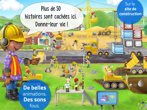 Tu aimes les chantiers et les engins de construction ? Sur notre chantier de construction, tu peux piloter une grue, une pelleteuse, un bulldozer, une tractopelle, une foreuse de tunnels et bien d\autres engins et les contrôler du bout de tes doigts. Cerise sur le gâteau : tu peux personnaliser le look de chacun de ces petits engins. Idéal pour les enfants de 2 à 6 ans. 12 engins de construction et plus de 50 histoires interactives à découvrir. C\EST TOI QUI PILOTES – tous les engins : > Super fonctionnalité : tu peux jouer librement avec tous les engins, les piloter et les contrôler. 1. Construis ton propre gratte-ciel avec la grue 2. Creuse un large trou avec la pelleteuse 3. Charge et décharge les grands camions à benne 4. Construis ta propre route avec trois engins : applique d\abord l\asphalte, puis aplatis-le et enfin, peins-le 5. Creuse un tunnel dans une grande montagne 6. Utilise la tractopelle pour déplacer de lourds rochers 7. Peins une maison dans ta couleur préférée (ou fais un mélange de plusieurs couleurs) 8. Cherche de l\eau partout à l\aide de la foreuse 9. Casse le sol à l\aide du marteau-piqueur 10. Transporte les gravats en dehors du chantier de construction à l\aide du camion à benne et beaucoup, beaucoup d\autres choses... PACK DE STYLES – donne un look personnalisé à tes engins : > Rayés ou à carreaux ? Tu peux habiller les engins comme tu le souhaites : cheveux, visage, casque, chemise, pantalon, chaussures – tu peux tout personnaliser. > Tu aimes le vert et pas le jaune ? Change facilement la couleur de tes engins ! > Blonds ou châtains, bouclés ou tressés ? C\est toi qui décides ! > Plus de 65 000 variations des machines et engins de levage sont possibles. AUTRES FONCTIONNALITÉS du chantier de construction > Comme toujours, nous avons caché plein de petites histoires à découvrir : > Du plaisir pour tous les âges avec plus de 50 aventures interactives animées : 1. Aide l\architecte à lire le plan. 2. Conduis le train à travers le tunnel 3. Oups,.. le maçon a muré la porte... que vas-tu faire ? 4. Cet oiseau embête l\opérateur de la grue... 5. Les constructeurs doivent faire une pause. 6. Aide le couvreur à terminer le toit. 7. Allume la radio et regarde les ouvriers danser ! > De nombreuses autres aventures t\attendent... il y a tant à découvrir. Qu\est-ce que tu attends ? SURPRISE – comme toujours : > Dessine le panneau de ta ville ! COMMUNIQUE – avec nous ! Nous aimons recevoir de tes nouvelles, alors ne sois pas timide et dis-nous ce que tu penses de nos applications ! Quelles nouveautés aimerais-tu découvrir ? Donne-nous ton avis sur @wonderkind sur Facebook.