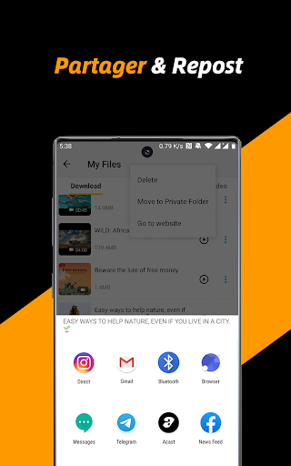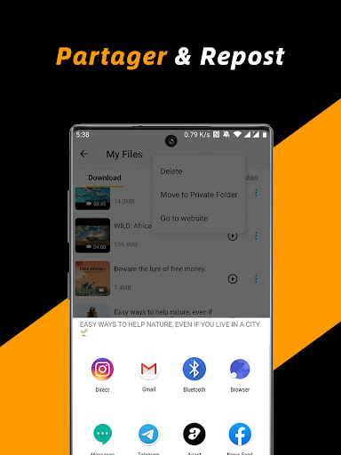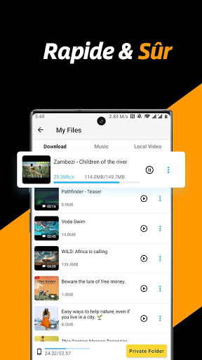 Le meilleur téléchargeur de vidéo HD privé gratuit et économiseur de fichiers pour vous. Avec la vitesse de téléchargement 4x plus rapide, la sécurité absolue des fichiers, ce serait le meilleur choix de téléchargeur vidéo pour vous. Vous en avez assez des moyens compliqués et dangereux de sauvegarder du contenu/des vidéos en ligne? Essaye celui-là! Il n\a jamais été aussi facile de télécharger, d\enregistrer et de republier des vidéos à partir des médias sociaux. Super rapide et totalement gratuit! Parcourez le site Web avec le navigateur intégré, gérez les fichiers téléchargés dans l\application et partagez vos vidéos et publications préférées avec vos amis. Tout ce dont vous avez besoin est cette application Free Video Downloader. Il s\agit d\un téléchargeur haute vitesse pour votre appareil Android. Cette application de téléchargement de vidéos peut vous aider à télécharger et à enregistrer des vidéos HD à partir de votre page d\accueil de médias sociaux en un seul clic. Extrêmement rapide, sûr et 100% gratuit! Tous les formats vidéo et différentes résolutions sont pris en charge. Lisez toutes les vidéos téléchargées avec le lecteur vidéo intégré, ajustez la vitesse de lecture, le mode de répétition et convertissez facilement les vidéos en audios. C\est également un gestionnaire de fichiers pratique pour vos fichiers téléchargés. Grâce à l\interface utilisateur conviviale et à la conception claire, vous pouvez facilement gérer, republier, lire, partager et supprimer tous vos fichiers dans l\application. Enregistrez vos vidéos préférées sur votre appareil Android et profitez-en partout et à tout moment. Le meilleur outil pour sauvegarder votre contenu de médias sociaux et le partager avec vos fans et amis. Comment utiliser: 1. Appuyez sur l\icône ou saisissez l\adresse du site Web sur la page d\accueil de l\application pour ouvrir le navigateur intégré. 2. L\application détectera automatiquement les vidéos. Appuyez sur le bouton de téléchargement pour démarrer le téléchargement. 3. Lisez et gérez tous les fichiers vidéo téléchargés dans l\onglet \Fichiers\. Principales caractéristiques: * Téléchargeur rapide pour Twitter, WhatsApp, Tumblr... Stable et sûr. * Prend en charge le téléchargement multi-threading et accélère les téléchargements plusieurs fois. * Sélectionnez différentes résolutions: économisez de l\espace en choisissant une petite taille et profitez de vidéos HD en sélectionnant le mode haute définition. * Téléchargez plusieurs fichiers en même temps et téléchargez des vidéos en arrière-plan. * Navigateur intégré et gestionnaire de fichiers intégré. Mettre en pause, reprendre et supprimer les téléchargements. Renommez, lisez, partagez et supprimez les fichiers avec une seule application. * Dossier privé. Créez votre propre dossier privé avec mot de passe. Protégez vos fichiers et votre vie privée. Clause de non-responsabilité: * Veuillez obtenir l\autorisation du propriétaire du contenu avant de republier des vidéos. * Nous ne sommes pas responsables de toute violation de la propriété intellectuelle résultant de repositionnements non autorisés de vidéos. * Cette application n\est pas officiellement associée à Instagram, Facebook, Twitter, TikTok, etc. * Le téléchargement de fichiers protégés par le droit d\auteur est interdit et réglementé par la loi du pays. * Cette application ne prend pas en charge le téléchargement de vidéos Youtube en raison de la politique du Play Store. Conditions d\utilisation: https://downloader.easylife.studio/termsofservice.html Politique de confidentialité: https://downloader.easylife.studio/policy.html